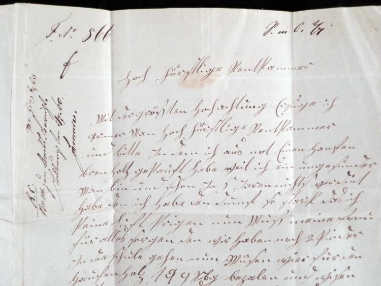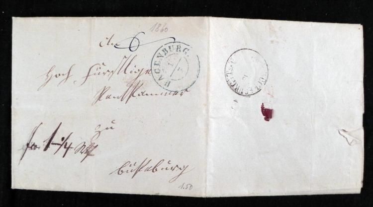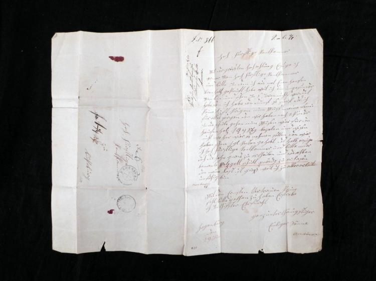 This original letter is a petition from a destitute invalid for discharge from a debt for a load of firewood. This letter is hand written in pen and ink on a single sheet of paper, 12 3/4 x 15 3/4 inches. It is folded into an envelope, with portion of red wax seal still present. The front is stampless, with blue double circle dated HAGENBURG, and black BUECKEBURG.T.&T. receiving mark. The letter is all in German, and was probably sent in the midst of a cold winter. We have no knowledge of whether the debt was waived, but this was back when people were more sympathetic to those in debt. * * It remains a fine German memento of its time period.