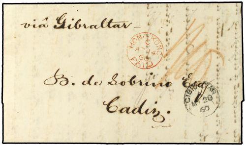 1860 (April 10) HONG KONG to CADIZ. Entire letter carried by the ´Ripon´ with Gibraltar with red HONG KONG/PAID cds of despatch, manuscript 1/10d. rate prepaid in red manuscript. Black Hong Kong cds on reverse and Gibraltar transit (May 28) in black. Scarce and very fine entire.