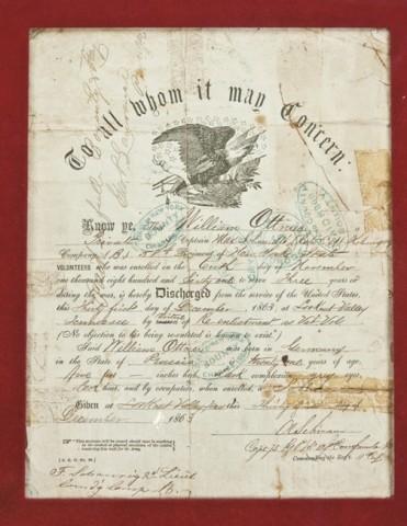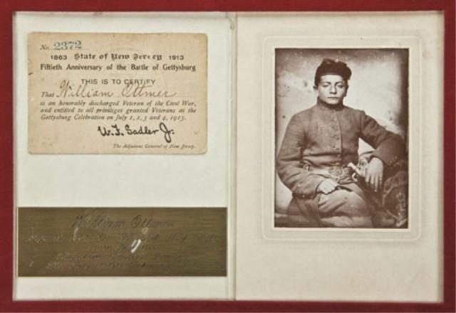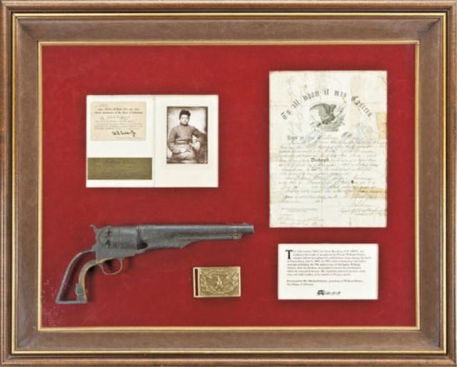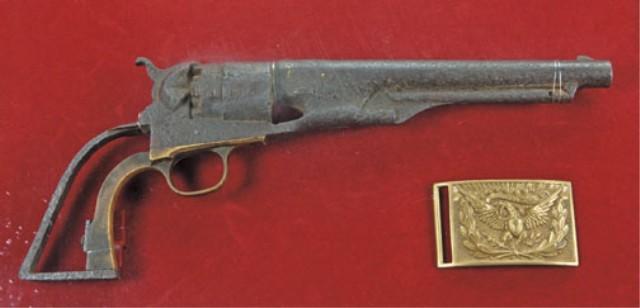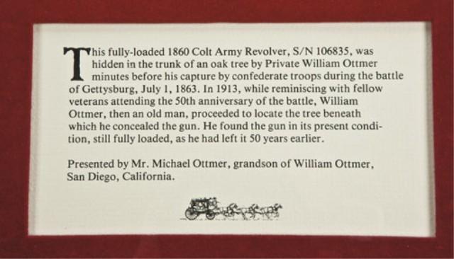 1860 Army Colt, serial #106835 in relic as-found condition with frame display. The frame display shows photography of William Ottmer of the 58th New York volunteers, born April 1844 in Germany. The photograph shows Ottmer at a very young age when he enlisted. Also framed in the display is Ottmer's discharge from 58th regiment New York volunteers where he enlisted at 17 years old. His discharge given at Lookout Valley, TN, 31 December 1863. Also framed with 1930 50th anniversary of Gettysburg identifying William Ottmer, signed by U.F. Saddler Jr, Adj. General of NJ. With eagle buckle ant title which reads This fully-loaded 1860 Col Army Revolver S/N106835 was hidden in the trunk of an oak tree by Private William Ottner" minutes before his capture by confederate troops during the battle of Gettysburg, July 1, 1863. In 1913, while reminiscing with fellow veterans attending the 50th anniversary of the battle, William Ottmer, then an old man, proceeded to locate the tree beneath which he concealed the gun. He found the gun in its present condition, still fully loaded, as he had left it 50 years earlier. Presented by Mr. Michael Ottmer, grandson of William Ottmer, San Diego, California. This"
