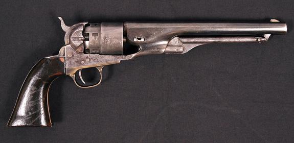 1860 Army Colt. A Civil War period Colt Army Revolver SN#126740 (1863-1864). A .44 cal. round 8" barrel. A six shot round cylinder roll engraved with a Naval Engagement scene. It has walnut grips with some wear and a small chip on the upper right one. A re-stamped brass trigger guard. The pistol has drifted to a grey patina with some dark areas and salt and pepper pitting, Overall a good example of a Civil War period Colt.