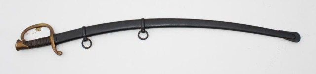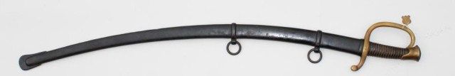 1860 Artillery sabre by Ames with D.R. inspection and 1863 date; the hilt is marked “22”. The Ames marking is very light and not visible without magnification, otherwise blade is good; hilt shows a deep patina withvery good wire wrapped grip; scabbard shows very old re-paint black enamel over rust; shield shaped tag attached to hilt reads “797”; a good sword with great patina. From an old collection in Auburn, CA in the heartof the Gold Country. Est.: $700-$1,400.