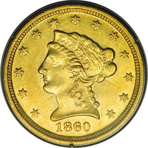 <B>1860-C $2 1/2 AU50 PCGS.</B></I> Variety 19-J. Well struck and lustrous with the detail of a coin that grades at least AU55, but lightly cleaned at one time and with some faint, scattered hairlines as a result. Well made for the issue with minor surface roughness in the fields as is inevitable. Both sides show light yellow-gold color. Housed in an old PCGS holder. The 1860-C is the last quarter eagle produced at the Charlotte mint and it is scarce with an original mintage of just 7,469 coins.<I><BR>From The Carolina Circle Collection.</B></I><BR><BR><B>Coin Engraver:</B> Christian Gobrecht<BR><BR><b>Shipping:</b> Coins & Currency (<a target="_blank" href="http://www.heritageauctions.com/common/shipping.php">view shipping information</a>)