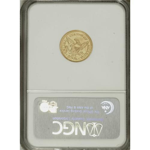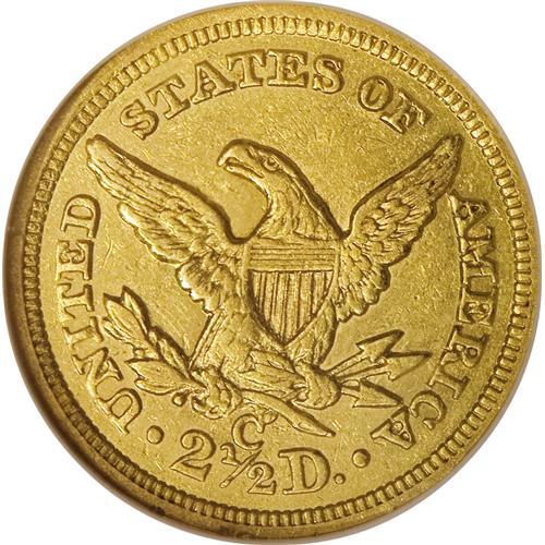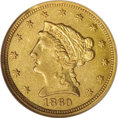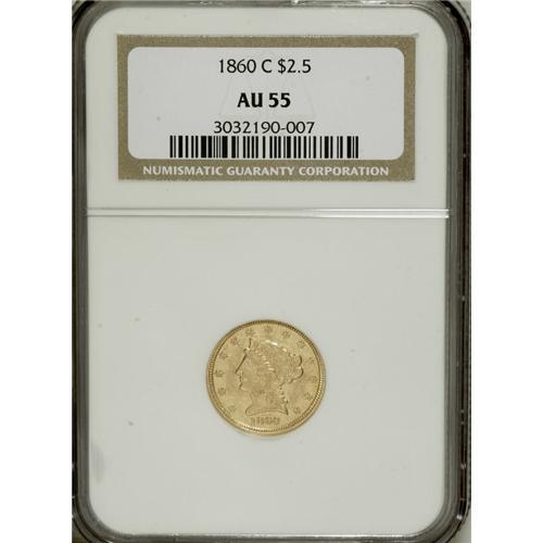 <B>1860-C $2 1/2 AU55 NGC.</B></I> Variety 19-J. The 1860-C is the last quarter eagle struck at the fabled Charlotte Mint, and the first struck there since 1858. Although most examples show weakness on the reverse, this piece is surprisingly strong on both sides. All of the star centrils are present and most are bold, and on the reverse the only mentionable weakness is on the eagle's left (facing) leg. This piece also possesses notable luster, although a bit of light field chatter and a smattering of abrasions are consistent with the Choice AU grade and a brief spate in circulation.<BR><BR><b>Shipping:</b> Coins & Currency (<a target="_blank" href="http://www.heritageauctions.com/common/shipping.php">view shipping information</a>)