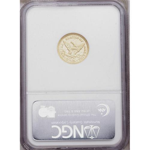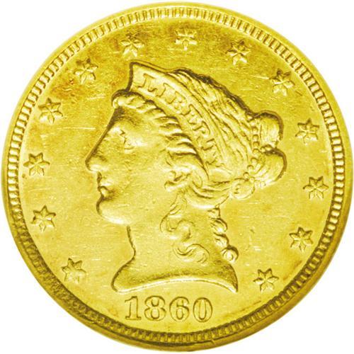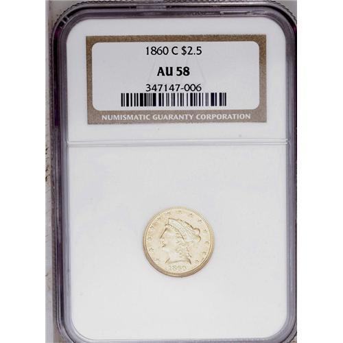 <B>1860-C<$2 1/2> AU58 NGC.</B></I> Variety 19-J. The 1860-C is a scarce coin in any grade, and is most often seen in VF and XF grades. It was among the most poorly produced quarter eagles struck at the Charlotte Mint. The AU58 specimen presented in this lot, while displaying minor softness on star 1 and on the eagle's neck and leg feathers, is better struck than typically seen, as evidenced by sharp definition in the remaining star centers and in Liberty's hair. The surfaces are bright yellow-gold, with light apricot-gold accents on the obverse, and retain ample luster in the recesses. Minute contact marks are evenly scattered over each side. Census: 29 in 58, 11 finer (5/06).