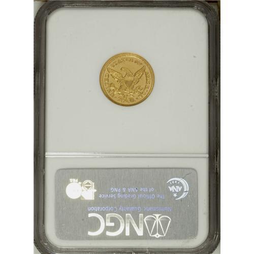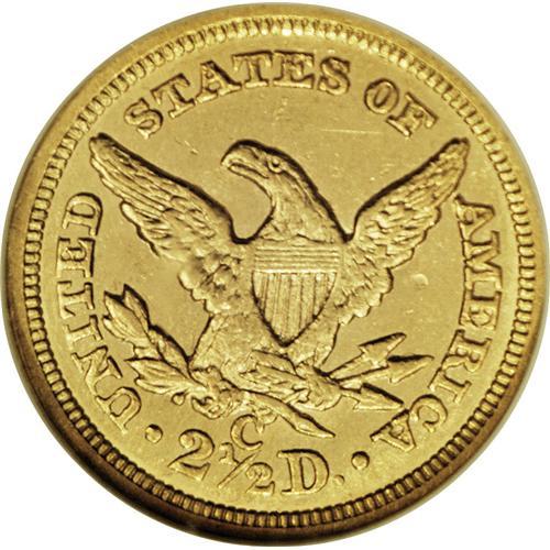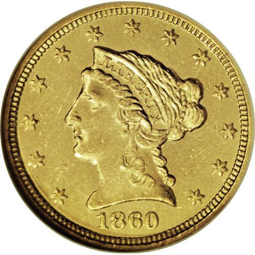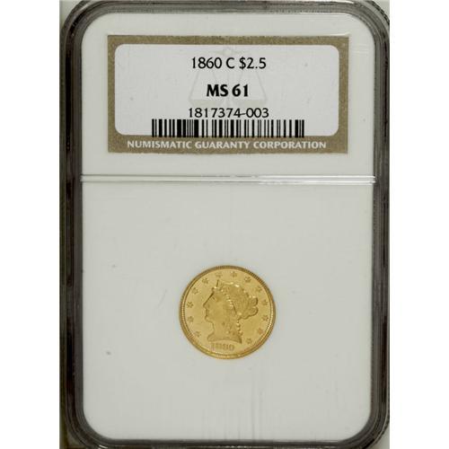 <B>1860-C $2 1/2 MS61 NGC.</B></I> Variety 19-J. The strike is above average. The eagle's talons and leg feathers are not completely brought up, but display decent sharpness. A couple of shallow mint-made strike-thrus on the reverse field do not distract. The luster is both satiny and mildly reflective. The obverse is moderately abraded for the grade. A scant 7,469 pieces were struck for the 1860-C, the last quarter eagle issue from the Charlotte Mint. Mint State examples are scarce, and coveted by Southern gold specialists. Census: 6 in 61, 5 finer (11/06).<BR><BR><b>Shipping:</b> Coin/Currency (<a target="_blank" href="http://www.heritageauctions.com/common/shipping.php">view shipping information</a>)