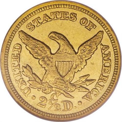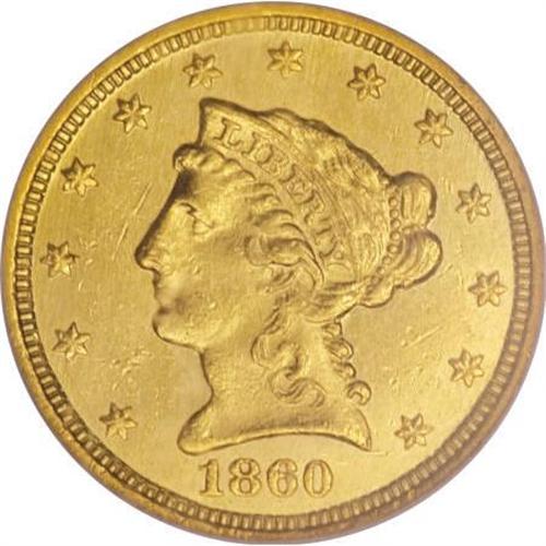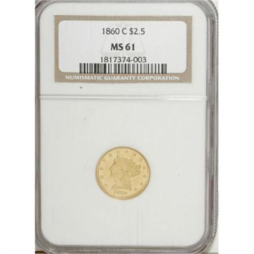 <B>1860-C $2 1/2 MS61 NGC.</B></I> Variety 19-J. Though softness is present on the eagle's legs and talons, this coin's overall definition is better than the norm. Lightly abraded overall with delicate yellow-gold surfaces that are satiny with a subtly reflective gleam. The minor roughness and the depression below the eagle's right (facing) wing are typical for this issue.<BR> Despite its status as one of the more available issues for the mint and denomination, like virtually all Charlotte gold issues, the 1860-C is conditionally rare in Mint State. Production amounted to just 7,469 pieces, and those coins experienced heavy circulation until the outbreak of war. An important representative of this historic issue, the last of the quarter eagles struck in North Carolina. Census: 6 in 61, 5 finer (7/07).<BR><BR><B>Coin Engraver:</B> Christian Gobrecht<BR><BR><b>Shipping:</b> Coins & Currency (<a target="_blank" href="http://www.heritageauctions.com/common/shipping.php">view shipping information</a>\)