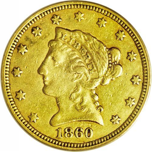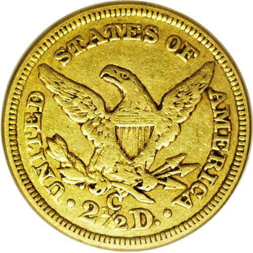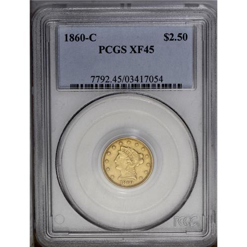 <B>1860-C $2 1/2 XF45 PCGS.</B></I> Variety 19-J. The strike is somewhat soft on the eagle, but the subdued straw-gold fields are void of unpleasant marks. A mere 7,469 pieces were struck for this final Charlotte Mint quarter eagle date; the North Carolina facility struck only half eagles in 1861, its final year of coinage. Population: 19 in 45, 37 finer (1/06).<BR><I>From The Carolina Gold Collection, Part Two.</B></I>