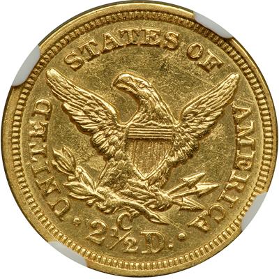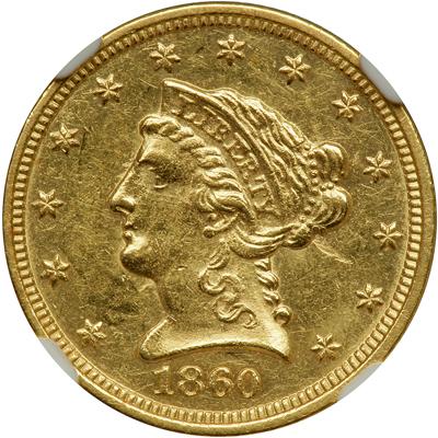 1860-C $2.50 Liberty. NGC graded MS-62. Well struck and untoned. A couple of minor planchet flaws as made, one behind the head of Liberty and another left of the eagle. These are mentioned only for accuracy and do not deter from the attractiveness of this coin.