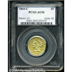 <table><tbody><tr><td><table> <TR><TD width="100%"><TABLE cellSpacing=1 cellPadding=3 width="100%" border=0><TBODY><TR><TD width="100%" bgColor=#79735c><FONT face=arial color=#ffffff size=3><B>Description</B> </FONT></TD></TR><TR><TD width="100%" bgColor=#ffffff><FONT face=arial size=2><B>1860-C $5 AU50 PCGS.</B></I> Variety 28-M. A very scarce Charlotte Half Eagle that has the third lowest mintage of the series with only 14,813 coins struck. This piece is rather typical for the issue with minimal wear and a bright, overall appearance. The obverse has a few small abrasions that are commensurate with the grade, while the reverse is slightly cleaner. The reverse is, of course, ill-defined having been struck from the improperly annealed die first used in 1859.<BR><I>From The New Millennium Collection, Part 3.</B></I> </FONT></TD></TR></TBODY></TABLE></TD></TR></TBODY></TABLE><BR><A name=PricesRealized></A><TABLE cellSpacing=0 cellPadding=0 width="100%" bgColor=#000000 border=0><TBODY><TR><TD width="100%"><TABLE cellSpacing=1 cellPadding=3 width="100%" border=0><TBODY><TR><TD width="100%" bgColor=#79735c><A name=PR><FONT face=arial color=#ffffff size=3><B>Previous Prices from Heritage Auctions</B> </FONT></A></TD></TR><TR><TD bgColor=#f6f6ed><TABLE cellSpacing=0 cellPadding=0 width="100%" border=1><TBODY><TR><TD align=middle width="33%"><B>Date</B></TD><TD align=middle width="33%"><B>Service</B></TD><TD align=middle width="33%"><B>Price</B></TD></TR><TR bgColor=whitesmoke><TD width="33%"><B>04/10/2001</B></TD><TD width="33%">PCGS</TD><TD width="33%">$2,600.00</TD></TR><TR bgColor=whitesmoke><TD width="33%"><B>02/12/1999</B></TD><TD width="33%">PCGS</TD><TD width="33%">$2,760.00</TD></TR><TR bgColor=whitesmoke><TD width="33%"><B>09/01/1993</B></TD><TD width="33%">PCGS</TD><TD width="33%">$4,400.00</TD></TR><TR bgColor=whitesmoke><TD width="33%"><B>05/01/1995</B></TD><TD width="33%">NGC</TD><TD width="33%">$2,530.00</TD></TR></TBODY></TABLE></TD></TR><TR><TD bgColor=#ffffff><FONT face=arial size=1 ?>PLEASE NOTE: All prices realized reflect the final hammer price PLUS the buyer's premium in auctions that charge a buyer's premium. Each item has a notation at the top of the listing indicating whether that lot included a buyer's premium. Example: A item that sells with a final hammer price of $100 and a 20% buyer's premium will display with a price realized of $120. All information listed is intended to be as accurate as possible, but errors are possible. Please use this guide carefully and inform us of any inaccuracies. </FONT></TD></TR></TBODY></TABLE></TD></TR></TBODY></TABLE><BR><TABLE cellSpacing=0 cellPadding=0 width="100%" bgColor=#000000 border=0><TBODY><TR><TD width="100%"><TABLE cellSpacing=1 cellPadding=3 width="100%" border=0><TBODY><TR><TD width="100%" bgColor=#79735c colSpan=6><FONT face=arial color=#ffffff size=3><B>Price Guide*</B> </FONT></TD></TR><TR bgColor=#f6f6ed><TD align=middle><B>Grade</B> </TD><TD align=middle><B>Coin World<BR>(Trends)</B> </TD><TD align=middle><B>Numismedia<BR>Retail</B> </TD><TD align=middle><B>Numismedia<BR>Wholesale</B> </TD><TD align=middle><B>Coin<BR>Universe</B> </TD><TD align=middle><B>Heritage<BR>Value Index</B> </TD></TR><TR bgColor=#ffffff><TD align=middle>45</TD><TD align=right>$3,000.00</TD><TD align=right>---</TD><TD align=right>---</TD><TD align=right>---</TD><TD align=right>$2,132.22</TD></TR><TR style="FONT-WEIGHT: bold" bgColor=#cccfdd><TD align=middle>50</TD><TD align=right>$4,000.00</TD><TD align=right>---</TD><TD align=right>$2,800.00</TD><TD align=right>---</TD><TD align=right>$2,827.78</TD></TR><TR bgColor=#ffffff><TD align=middle>53</TD><TD align=right>---</TD><TD align=right>---</TD><TD align=right>$4,650.00</TD><TD align=right>---</TD><TD align=right>$3,955.61</TD></TR><TR bgColor=#ffffff><TD colSpan=6><FONT size=1>*All information listed is intended to be as accurate as possible, but errors are possible. No item may be returned or refused based on this information which is provided as a service to our customers. You should contact each pricing source directly to determine the accuracy of this information. </FONT></TD></TR></TBODY></TABLE></TD></TR></TBODY></TABLE><BR><TABLE cellSpacing=0 cellPadding=0 width="100%" bgColor=#000000 border=0><TBODY><TR><TD width="100%"><TABLE cellSpacing=1 cellPadding=3 width="100%" border=0><TBODY><TR><TD width="100%" bgColor=#79735c><FONT face=arial color=#ffffff size=3><B>Population Guide</B> </FONT></TD></TR><TR bgColor=#ffffff><TD align=middle><!-- Begin Output of Population Grid--><TABLE cellSpacing=0 cellPadding=0 width="100%" border=0><TBODY><TR><TD vAlign=center><TABLE cellSpacing=0 width="100%" border=1 cellsadding="3"><TBODY><TR><TD vAlign=center><TABLE cellSpacing=0 cellPadding=3 width="100%" border=1><TBODY><TR><TD vAlign=center align=middle bgColor=#f0f1e8 colSpan=2 <CENTER><FONT face=Arial size=2><B>PCGS Pop </B></FONT><CENTER></CENTER></TD><TD vAlign=center align=middle bgColor=#f0f1e8 colSpan=2><CENTER><FONT face=Arial size=2><B>NGC Pop</B></CENTER></FONT></TD></TR><TR><TD vAlign=center><FONT face=Arial size=2>(50)</FONT> </TD><TD vAlign=center align=right><FONT face=Arial size=2>12</FONT> </TD><TD vAlign=center><FONT face=Arial size=2>(50)</FONT> </TD><TD vAlign=center align=right><FONT face=Arial size=2>8</FONT> </TD></TR><TR><TD vAlign=center><FONT face=Arial size=2>(>50)</FONT> </TD><TD vAlign=center align=right><FONT face=Arial size=2>27</FONT> </TD><TD vAlign=center><FONT face=Arial size=2>(>50)</FONT> </TD><TD vAlign=center align=right><FONT face=Arial size=2>43</FONT> </TD></TR></TBODY></TABLE></TD></TR></TBODY></TABLE></TD></TR></TBODY></TABLE><!-- End Output of Population Grid--></TD></TR></TBODY></TABLE></TD></TR></TBODY></TABLE><BR><TABLE cellSpacing=0 cellPadding=0 width="100%" bgColor=#000000 border=0><TBODY><TR> <font color='#000000'><span style='background-color: #FFFFFF'><td bgcolor='#FFFFFE'> Important notice: Heritage usually auctions material at the rate of 200-2