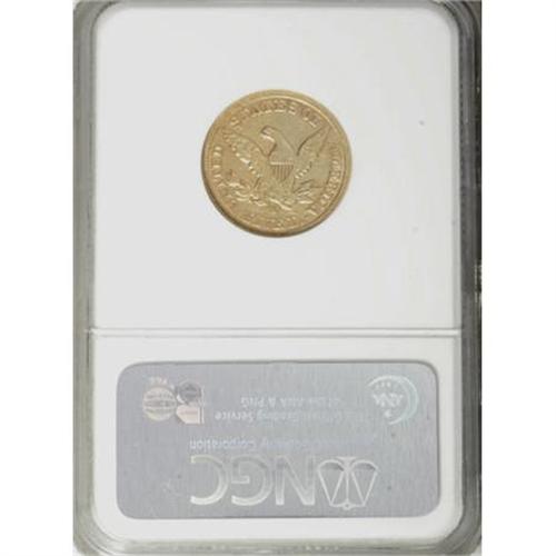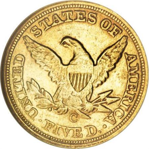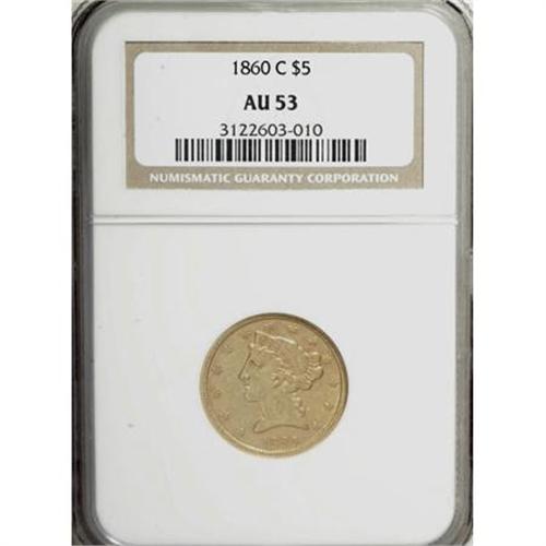 <B>1860-C $5 AU53 NGC.</B></I> Variety 28-M. Luster brightens stars, letters, and other recessed areas. The border elements are well struck, although the eagle is softly impressed, as is invariably the case for this later Charlotte issue. The obverse field has a few moderate marks, but the present piece retains its original green-gold skin, and is desirable as such.<BR><I>Ex: Greenwich Collection (Bowers and Merena, 1/91), lot 180.</B></I><BR><I>From The John Stimson, Sr. Collection, Part Two.</B></I><BR><BR><B>Coin Engraver:</B> Christian Gobrecht<BR><BR><b>Shipping:</b> Coins & Currency (<a target="_blank" href="http://www.heritageauctions.com/common/shipping.php">view shipping information</a>)