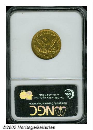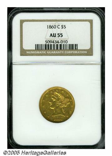 <B>1860-C<$5> AU55 NGC.</B></I> Variety 28-M. Here is an attractive coin for the grade. The obverse is fairly sharp with some luster remaining in the fields, and strong stars all around. The surfaces show moderate handling ticks expected for the grade. As always, the reverse is weakly impressed on the eagle, with softness noted on the lettering as well. The Charlotte Mint continued to use the same reverse die from the 1859 half eagle issue, and by 1860 the die showed both rust and extensive wear when this coin was struck. Things didn't improve in 1861 either. For the Charlotte Mint specialist this quality is about the best one can expect to locate, and most collectors will be happy to acquire this high grade example of this important C-mint rarity. The combined NGC and PCGS population reports show 19 coins this high with 53 pieces seen finer of this date (6/05).