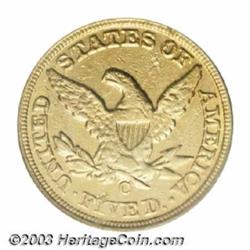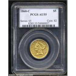 <table><tr><td><TABLE cellSpacing=0 cellPadding=0 width="100%" bgColor=#000000 border=0><TBODY> <TR><TD width="100%"><TABLE cellSpacing=1 cellPadding=3 width="100%" border=0><TBODY><TR><TD width="100%" bgColor=#79735c><FONT face=arial color=#ffffff size=3><B>Description</B> </FONT></TD></TR><TR><TD width="100%" bgColor=#ffffff><FONT face=arial size=2><B>1860-C $5 AU55 PCGS.</B></I> Winter 28-M. Orange-gold and steel-blue patina ensures the originality of this scarce late date Charlotte Half Eagle. The eagle is softly struck, as is characteristic of the issue, and the hair curl below Liberty's ear is also somewhat soft. The borders are well struck, however. The eagle has a clashmark (as made) below the neck, and the reverse has a couple of small contact marks. Only 14,813 pieces were struck. Population: 7 in 55, 16 finer (9/03). </FONT></TD></TR></TBODY></TABLE></TD></TR></TBODY></TABLE><BR><A name=PricesRealized></A><TABLE cellSpacing=0 cellPadding=0 width="100%" bgColor=#000000 border=0><TBODY><TR><TD width="100%"><TABLE cellSpacing=1 cellPadding=3 width="100%" border=0><TBODY><TR><TD width="100%" bgColor=#79735c><A name=PR><FONT face=arial color=#ffffff size=3><B>Previous Prices from Heritage Auctions</B> </FONT></A></TD></TR><TR><TD bgColor=#f6f6ed>No Prior Data Recorded </TD></TR><TR><TD bgColor=#ffffff><FONT face=arial size=1 ?>PLEASE NOTE: All prices realized reflect the final hammer price PLUS the buyer's premium in auctions that charge a buyer's premium. Each item has a notation at the top of the listing indicating whether that lot included a buyer's premium. Example: A item that sells with a final hammer price of $100 and a 20% buyer's premium will display with a price realized of $120. All information listed is intended to be as accurate as possible, but errors are possible. Please use this guide carefully and inform us of any inaccuracies. </FONT></TD></TR></TBODY></TABLE></TD></TR></TBODY></TABLE><BR><TABLE cellSpacing=0 cellPadding=0 width="100%" bgColor=#000000 border=0><TBODY><TR><TD width="100%"><TABLE cellSpacing=1 cellPadding=3 width="100%" border=0><TBODY><TR><TD width="100%" bgColor=#79735c colSpan=6><FONT face=arial color=#ffffff size=3><B>Price Guide*</B> </FONT></TD></TR><TR bgColor=#f6f6ed><TD align=middle><B>Grade</B> </TD><TD align=middle><B>Coin World<BR>(Trends)</B> </TD><TD align=middle><B>Numismedia<BR>Retail</B> </TD><TD align=middle><B>Numismedia<BR>Wholesale</B> </TD><TD align=middle><B>Coin<BR>Universe</B> </TD><TD align=middle><B>Heritage<BR>Value Index</B> </TD></TR><TR bgColor=#ffffff><TD align=middle>53</TD><TD align=right>---</TD><TD align=right>---</TD><TD align=right>$4,650.00</TD><TD align=right>---</TD><TD align=right>$4,279.61</TD></TR><TR style="FONT-WEIGHT: bold" bgColor=#cccfdd><TD align=middle>55</TD><TD align=right>$8,500.00</TD><TD align=right>---</TD><TD align=right>$5,950.00</TD><TD align=right>$6,500.00</TD><TD align=right>$5,247.50</TD></TR><TR bgColor=#ffffff><TD align=middle>58</TD><TD align=right>$11,000.00</TD><TD align=right>---</TD><TD align=right>$6,575.00</TD><TD align=right>---</TD><TD align=right>$7,677.50</TD></TR><TR bgColor=#ffffff><TD colSpan=6><FONT size=1>*All information listed is intended to be as accurate as possible, but errors are possible. No item may be returned or refused based on this information which is provided as a service to our customers. You should contact each pricing source directly to determine the accuracy of this information. </FONT></TD></TR></TBODY></TABLE></TD></TR></TBODY></TABLE><BR><TABLE cellSpacing=0 cellPadding=0 width="100%" bgColor=#000000 border=0><TBODY><TR><TD width="100%"><TABLE cellSpacing=1 cellPadding=3 width="100%" border=0><TBODY><TR><TD width="100%" bgColor=#79735c><FONT face=arial color=#ffffff size=3><B>Population Guide</B> </FONT></TD></TR><TR bgColor=#ffffff><TD align=middle><!-- Begin Output of Population Grid--><TABLE cellSpacing=0 cellPadding=0 width="100%" border=0><TBODY><TR><TD vAlign=center><TABLE cellSpacing=0 width="100%" border=1 cellsadding="3"><TBODY><TR><TD vAlign=center><TABLE cellSpacing=0 cellPadding=3 width="100%" border=1><TBODY><TR><TD vAlign=center align=middle bgColor=#f0f1e8 colSpan=2 <CENTER><FONT face=Arial size=2><B>PCGS Pop </B></FONT><CENTER></CENTER></TD><TD vAlign=center align=middle bgColor=#f0f1e8 colSpan=2><CENTER><FONT face=Arial size=2><B>NGC Pop</B></CENTER></FONT></TD></TR><TR><TD vAlign=center><FONT face=Arial size=2>(55)</FONT> </TD><TD vAlign=center align=right><FONT face=Arial size=2>7</FONT> </TD><TD vAlign=center><FONT face=Arial size=2>(55)</FONT> </TD><TD vAlign=center align=right><FONT face=Arial size=2>6</FONT> </TD></TR><TR><TD vAlign=center><FONT face=Arial size=2>(>55)</FONT> </TD><TD vAlign=center align=right><FONT face=Arial size=2>16</FONT> </TD><TD vAlign=center><FONT face=Arial size=2>(>55)</FONT> </TD><TD vAlign=center align=right><FONT face=Arial size=2>27</FONT> </TD></TR></TBODY></TABLE></TD></TR></TBODY></TABLE></TD></TR></TBODY></TABLE><!-- End Output of Population Grid--></TD></TR></TBODY></TABLE></TD></TR></TBODY></TABLE><BR><TABLE cellSpacing=0 cellPadding=0 width="100%" bgColor=#000000 border=0><TBODY><TR> Important notice: Heritage usually auctions material at the rate of 200-250 lots per hour. On some occasions eBay Live bid software or the Internet may not be able to keep up with the pace of the auction. We recommend placing a realistic absentee bid now as insurance to avoid disappointment. Occasionally the auctioneer may eliminate or reject an eBay Live bid, and the auctioneer may also reopen a lot after the close of the eBay live bidding (usually because we missed an audience bid), and may reject your bid even if it shows you as the winning bidder. By bidding via eBay Live, you agree that Heritage may award the lot to another bidder at its sole discretion under the circumstances described above or any other reasonable circumstances. Also please note that all Heritage lots purchased through eBay Live carry 