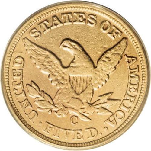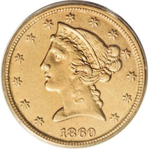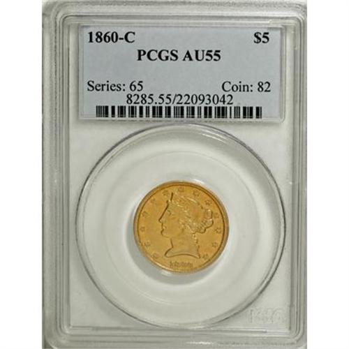 <B>1860-C $5 AU55 PCGS.</B></I> Variety 28-M. This scarce Charlotte half eagle date has the third-lowest mintage of the series, with just 14,813 coins originally produced. This piece is better-than-average for the issue, with pleasing lime-gold coloration and an attractive overall appearance. Both sides show wispy field hairlines and a few minor abrasions. The reverse is ill-defined, having been struck from an improperly annealed die. Population: 9 in 55, 23 finer (11/07).<BR><I>From The Waxhaw Collection.</B></I><BR><BR><B>Coin Engraver:</B> Christian Gobrecht<BR><BR><b>Shipping:</b> Coins & Currency (<a target="_blank" href="http://www.heritageauctions.com/common/shipping.php">view shipping information</a>)