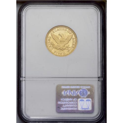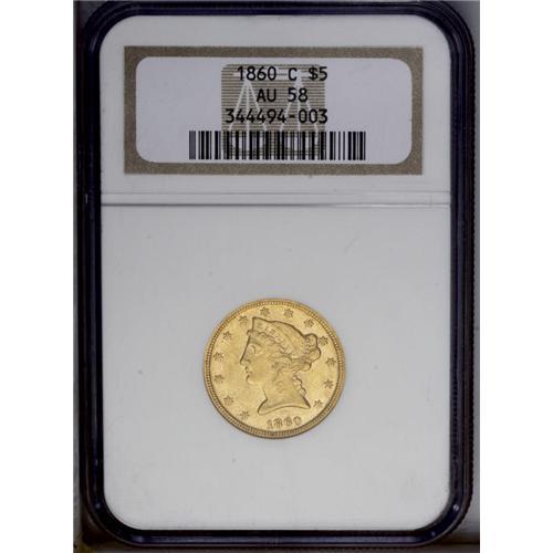 <B>1860-C<$5> AU58 NGC.</B></I> Variety 28-M. Only 14,813 examples of this date were struck, and few of those have survived for nearly a century and a half until today. The reverse has mushy design details, resulting from the overuse of a die that was used during the previous year. Otherwise, this is a lovely example with sharp design features. The surfaces have deep yellow-gold with orange overtones. Numerous tiny abrasions are noted on both sides, but none of these are individually significant. <BR><BR><B>Important notice:</B> Heritage usually auctions material at the rate of 200-250 lots per hour. On some occasions eBay Live bid software or the Internet may not be able to keep up with the pace of the auction. We recommend placing a realistic absentee bid now as insurance to avoid disappointment. Occasionally the auctioneer may eliminate or reject an eBay Live bid, and the auctioneer may also reopen a lot after the close of the eBay live bidding (usually because we missed an audience bid), and may reject your bid even if it shows you as the winning bidder. By bidding via eBay Live, you agree that Heritage may award the lot to another bidder at its sole discretion under the circumstances described above or any other reasonable circumstances. Since eBay bids are not shown to us until we open the lot on the floor, we treat those bids just like floor bids. In most cases the floor responds before the eBay bid is presented to us, due to Internet lag time, so for consistency we have made it a policy that floor bids are always considered first over tie eBay live bids. Also please note that all Heritage lots purchased through eBay Live carry a 20% Buyer's Premium. Please make sure you read the Terms and Conditions before you bid. This lot is being auctioned in conjunction with a live floor auction by Heritage Galleries & Auctioneers. All final auction and invoice information will be supplied by Heritage Galleries & Auctioneers, and all other information should be considered preliminary. Lot:2749 <BR><BR><B>Winning Notification and Billing:</B> After the FINAL session in this auction is complete, Heritage will send e-mail and snail mail invoices. This process normally takes several days. All final auction and invoice information will be supplied by Heritage Galleries & Auctioneers, and all other information should be considered preliminary. <BR><BR>This auction will be conducted on a live auction floor and over the Internet through eBay Live. If you choose to place an absentee bid, please take a moment to <font color='#0000ff'><u><a href='http://pages.ebay.com/liveauctions/help/before/laabsentee.html'>learn how eBay Live absentee bidding works</a></u></font><font color='#000000'>