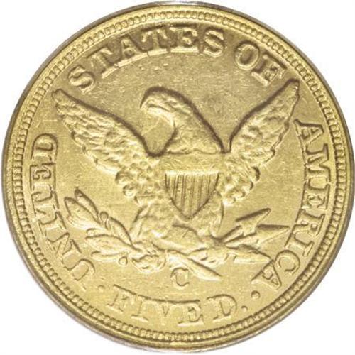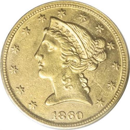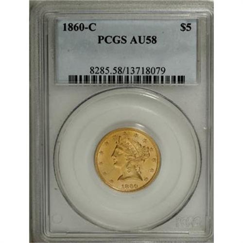 <B>1860-C $5 AU58 PCGS.</B></I> Typically struck for the date, the obverse displays much better detail than the reverse. On this piece, the obverse shows good overall detail with some minor weakness seen on the high spots. There are light ticks in the fields seen on both sides; none of these is major or detracting. The luster is frosty with some minor breaks in the fields, as one would expect on a coin graded AU58. The color is a light to medium orange-gold. The overall level of eye appeal for this piece is acceptable for the grade and it is certainly an above average example of the second-to-last half eagle produced at the Charlotte mint.<BR> An estimated 150-175 pieces are known and this date ranks right in the middle of the half eagles from this mint in terms of high grade and overall rarity. Most 1860-C half eagles are found in VF and XF and properly graded AUs are quite scarce with three dozen or so known. In Uncirculated there appear to be around six to eight known led by a single MS64 graded by NGC.<I><BR>From The Carolina Circle Collection.</B></I><BR><BR><B>Coin Engraver:</B> Christian Gobrecht<BR><BR><b>Shipping:</b> Coins & Currency (<a target="_blank" href="http://www.heritageauctions.com/common/shipping.php">view shipping information</a>)