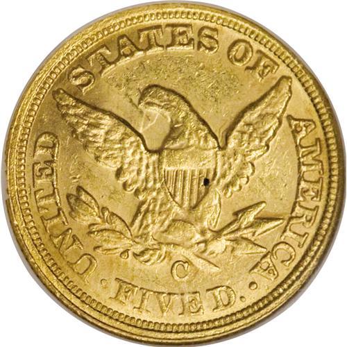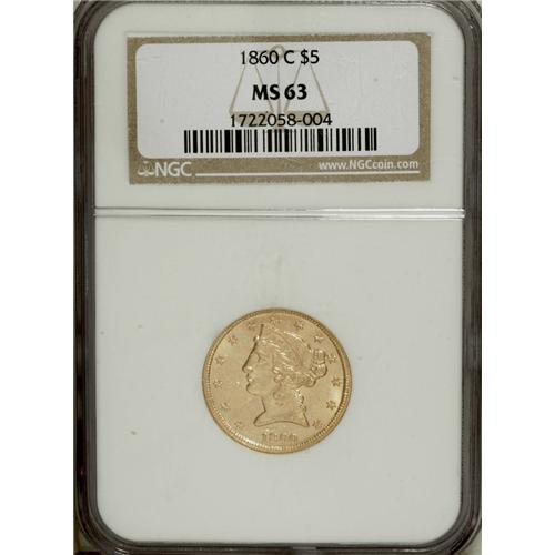<B>1860-C $5 MS63 NGC.</B></I> Variety 28-M. Not many of the 14,813 Charlotte Mint half eagles struck in 1860 have survived, and high-quality examples are major rarities. Jeff Garrett and Ron Guth note: "Most of the coins seen for the date are heavily circulated. The average 1860-C half eagle is no better than Extremely Fine. High-grade examples are known, but seldom offered. Just a few examples of the 1860-C have been graded at the choice level." In fact, NGC has certified just one coin finer than this piece, and PCGS has never topped the grade of the example offered here. It is an attractive piece with brilliant yellow luster and reflective fields. The obverse is nicely struck while the reverse has the indistinct appearance associated with every known example of the date. Census: 1 in 63, 1 finer (4/07).<BR><BR><b>Shipping:</b> Coins & Currency (<a target="_blank" href="http://www.heritageauctions.com/common/shipping.php">view shipping information</a>)