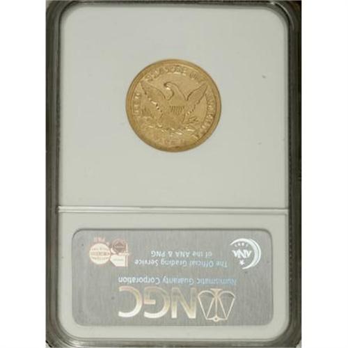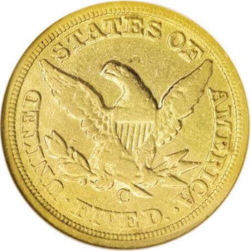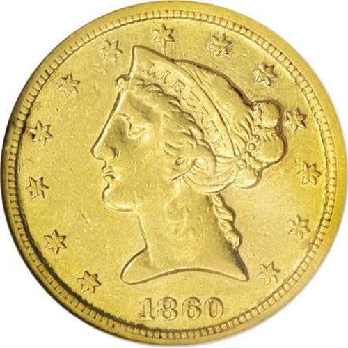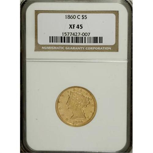 <B>1860-C $5 XF45 NGC.</B></I> Variety 28-M. Luster outlines the design recesses of this yellow-gold Charlotte five. The eagle and Liberty's curls are typically struck, and a slight obverse rim ding is present at 9:30. The subdued surfaces lack consequential marks. A mere 14,813 pieces were struck.<BR><BR><B>Coin Engraver:</B> Christian Gobrecht<BR><BR><b>Shipping:</b> Coins & Currency (<a target="_blank" href="http://www.heritageauctions.com/common/shipping.php">view shipping information</a>)