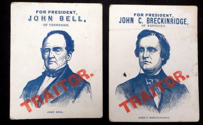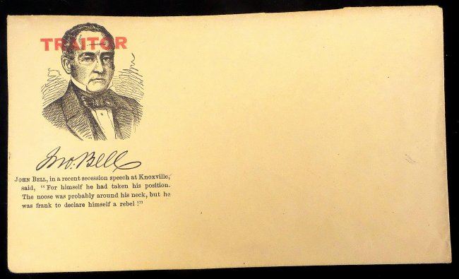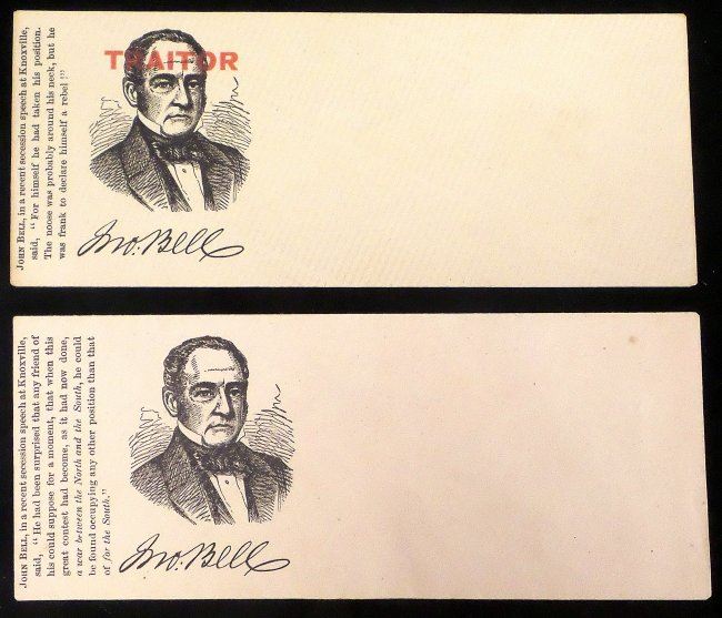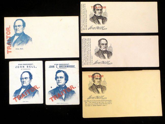 Comprises four envelopes featuring a bust-length portrait of John Bell. Three feature red ink "Traitor" hand stamps across Bell's image. Two are the imprinted "JOHN BELL, in a recent secession speech at Knoxville, said, 'For himself he had taken his position. The noose was probably around his neck, then he was frank to declare himself a rebel!'." One bears the inscription "JOHN BELL, in a recent secession speech at Knoxville, said, 'He had been surprised that any friend of his could suppose for a moment, that when this great contest had become, as it had not done, a war between the North and the South, he could be found occupying any other position than that of for the South'." Accompanied by two campaign cards, one bears a bust-length portrait of John Bell, the other bears a bust-length portrait of John Breckinridge. Both are stamped "Traitor" across the central images in red ink. Envelope sizes vary from 2-3/8" H x 5-5/8" W to 3-3/8" H x 5-5/8" W. All cards 3-1/4" H x 2-1/2" W. Condition varies, all sold together as is. Defects include age-toning, creases, fold wear, water stains, and mounting residue on verso.