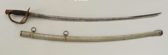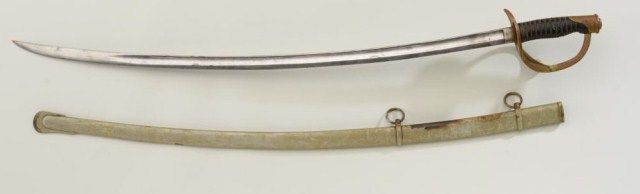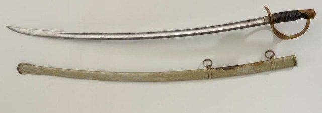 1860 Cavalry saber by Emerson & Silver Trenton N. J. dated 1864 with scabbard. The scabbard has been re-nickeled long ago and most of the finish remains. The grip and handle are good other than wood has swelledand split shows an old rewrap. Blade well marked and good. Est.; $250-$500