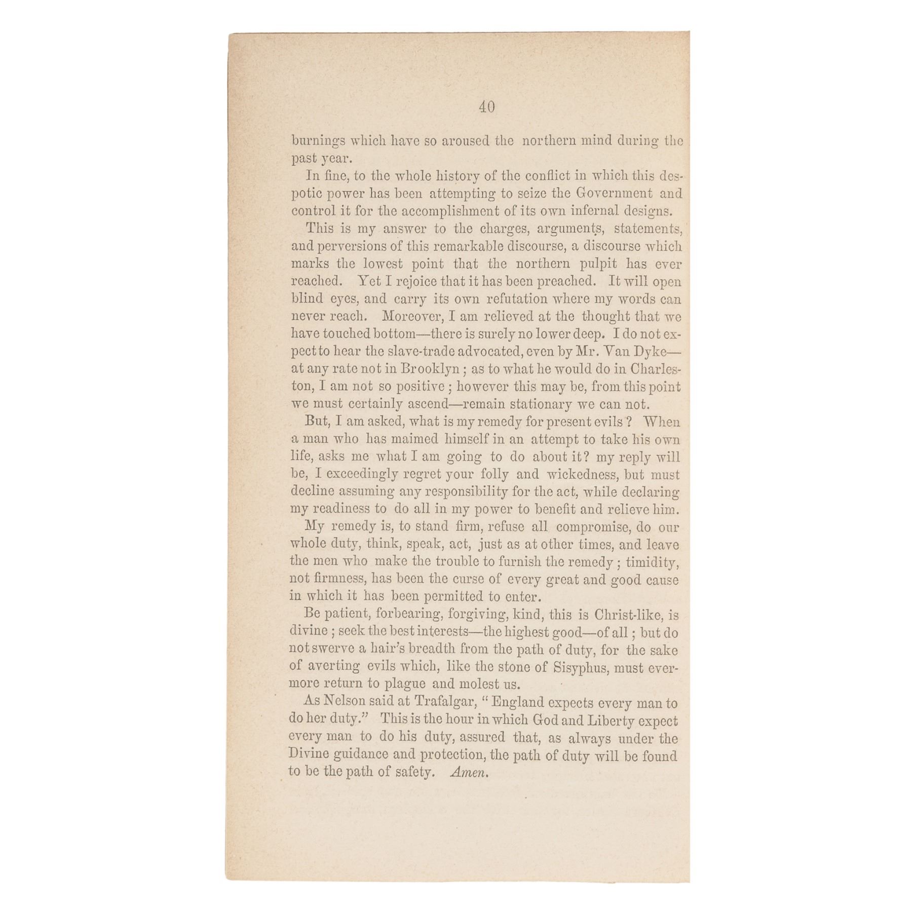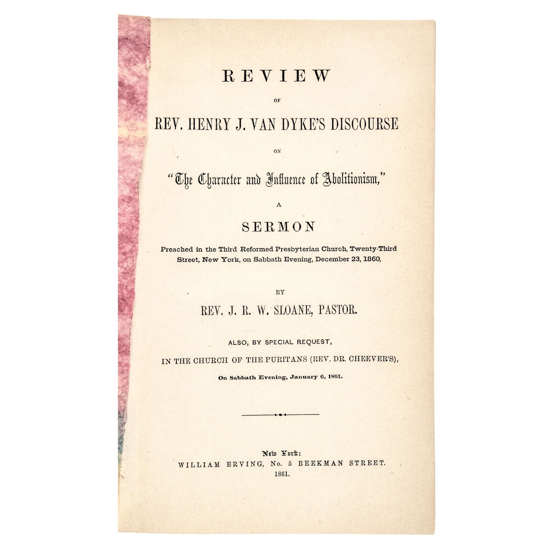 January 6, 1861-Dated Civil War Era, Imprint titled, “Review of Henry J. Van Dyke’s Discourse on The Character and Influence of Abolitionism,” by J.R.W. Sloane, published by William Erving, Beekman Street, New York, Choice Extremely Fine.