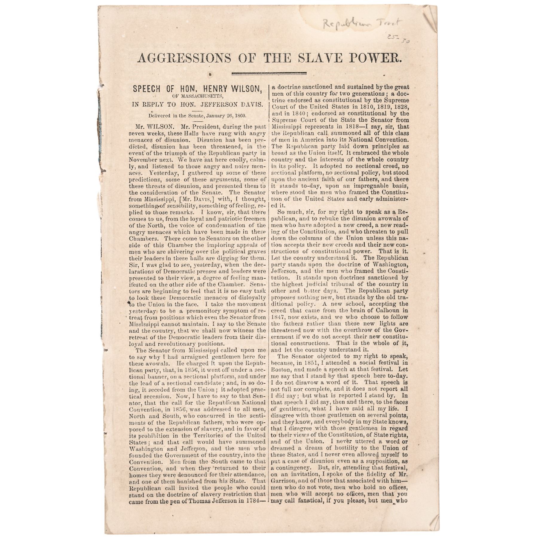 January 26, 1860-Dated Printed Booklet titled, “Agressions of the Slave Power. Speech of Hon. Henry Wilson of Massachusetts. In Reply to Hon. Jefferson Davis, Delivered in the Senate January 26, 1860.” Published by Buell & Blanchard, Printers, Washington, D.C. This 8-page printed copy of a speech by Wilson given in the Senate measures 5.75” x 9”. An amazing contest of ideas!