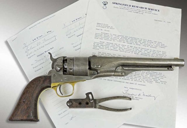 .44 cal., manufactured 1862, issued to Sgt. John W. Kennedy 16th Pennsylvania Volunteer Calvary. Complete with Springfield Research Service documentation and copy of Sgt. Kennedy's Service Record. Revolver shows gray smooth patina. Overall