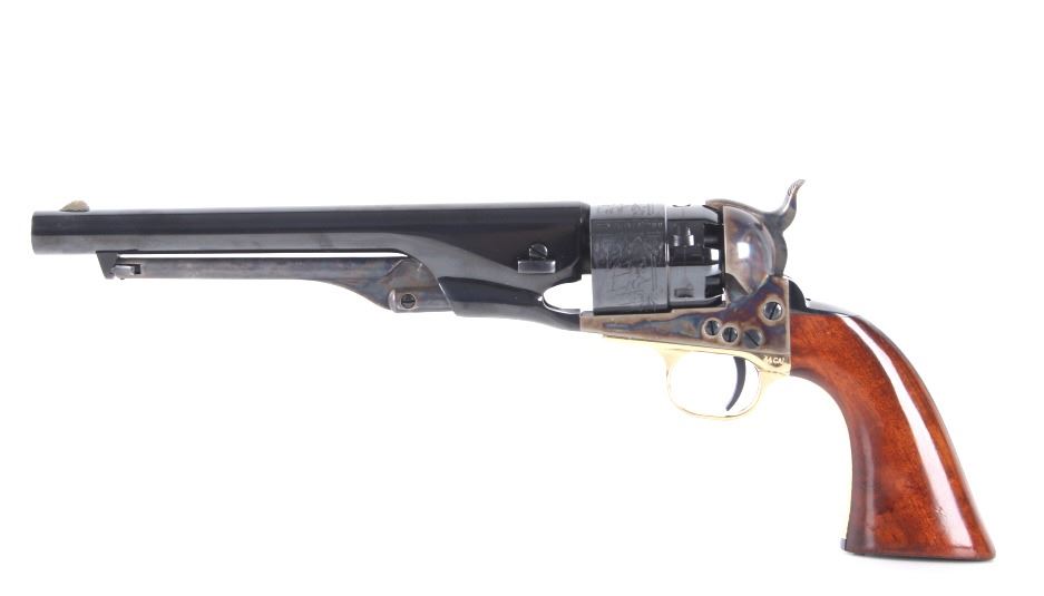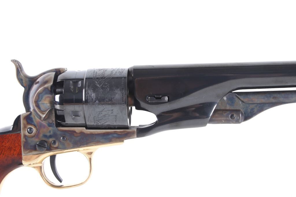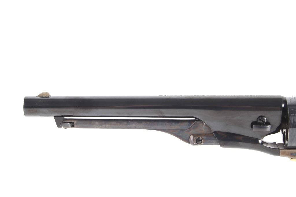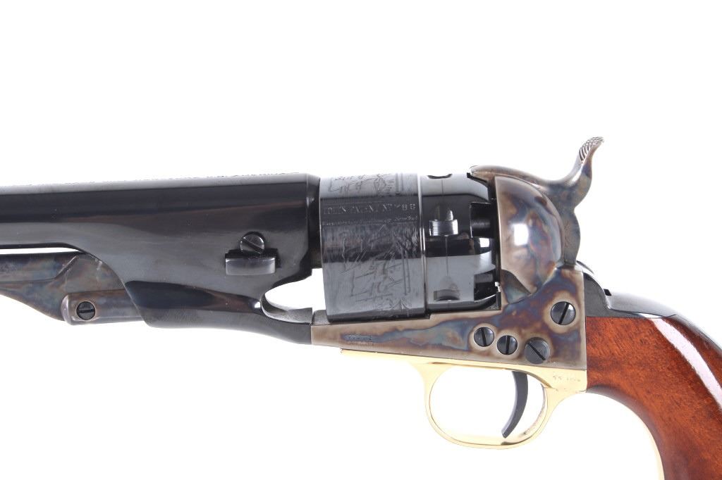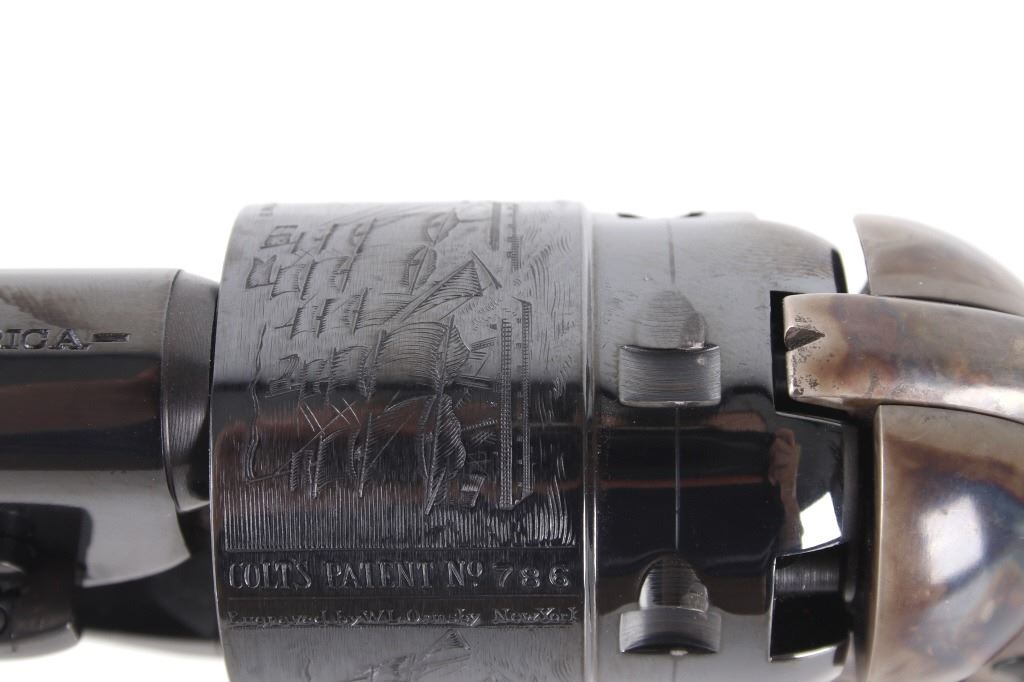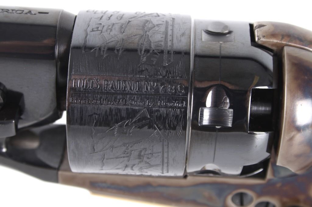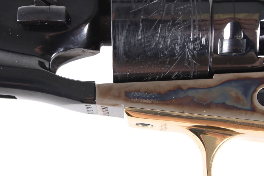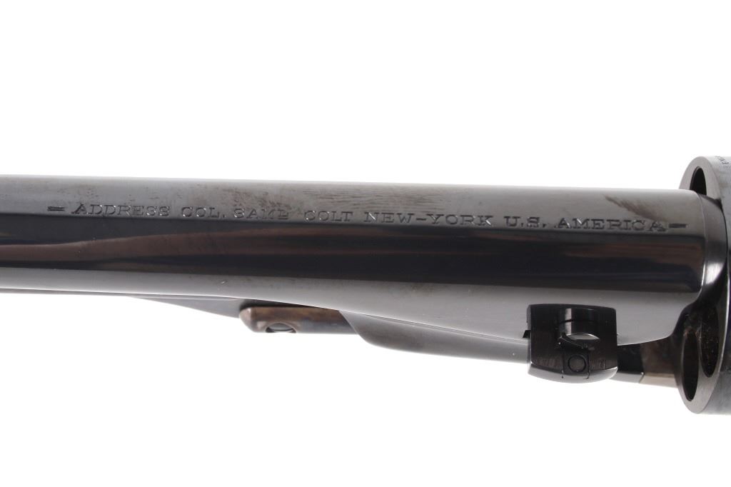 Featured in this lot is a Colt Model 1860 Army percussion cap revolver from the Colt Signature Series chambered in .44 caliber manufactured in Belgium. The revolver features an 8" barrel, etched 6 shot cylinder, walnut grips, brass trigger guard, brass blade front sight, and hammer notch rear sight. This was one of the most widely issued and popular revolvers of the Civil War, with many, if not most, going to the West after the war for Indian Wars or frontier service. This example is complete and functioning. It has matching numbers on the trigger guard, frame, and barrel. Overall, it displays an attractive deep aged patina with no evidence of having been buffed, polished, steel-wooled, or cleaned. This revolver also features the correct 8” barrel with sharp and clear Colt one line address on top, correct small front sight, attached loading lever functions correctly, one piece walnut grips fully intact. It is in excellent overall condition. The cylinder displays an engraved image of sailing ships by W.L. Ormsby and the cylinder is marked "Colt's Patent No. 786 Engraved by W.L. Ormsby New York". The top of the barrel is marked "ADDRESS COL. SAML COLT NEW-YORK U.S. AMERICA" with the side of the frame marked "Colts Patent" and ".44 CAL". The frame, trigger guard, and barrel are marked with matching serial numbers. The revolver displays wonderful condition with tight mechanics and blue'd patina. The pistol weighs 2lbs 8oz. Serial Number: 222786. This firearm qualifies as an Antique / Black Powder and does not require FFL Transfer or NICS Background Check. This is an original Colt from the factory and is from the Colt Black Powder Series.
