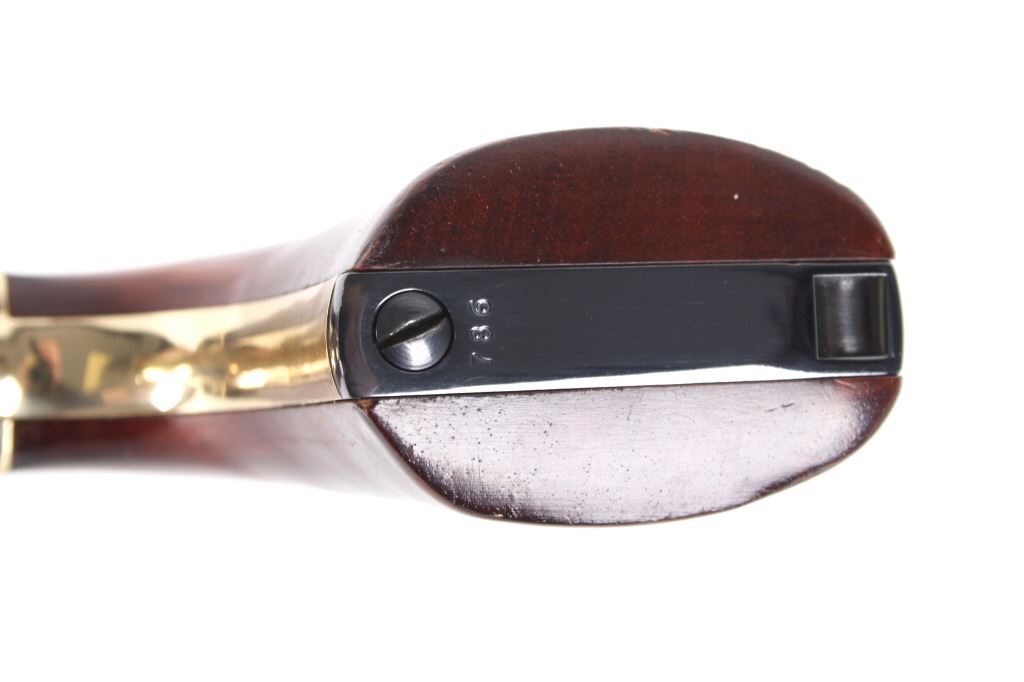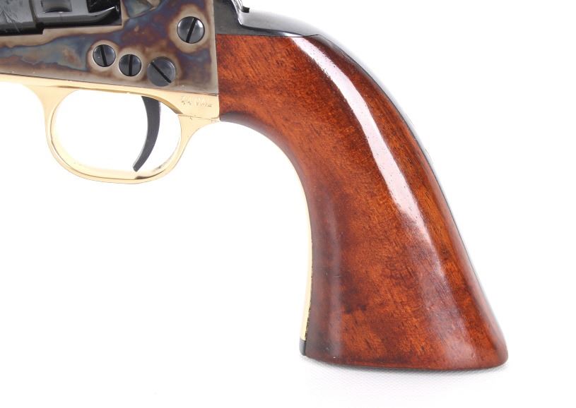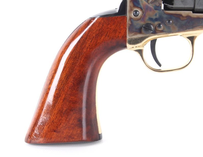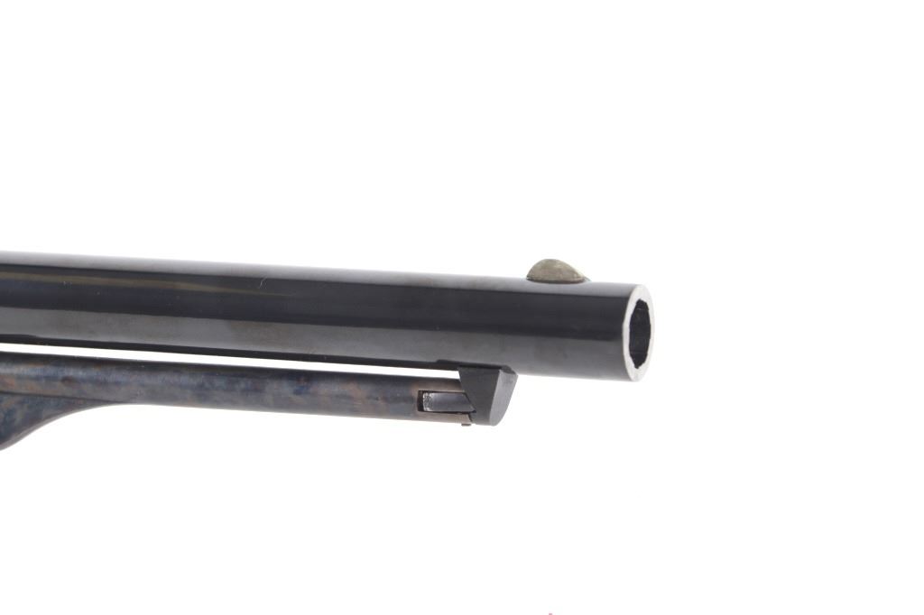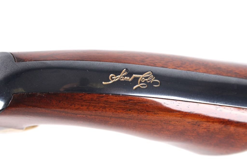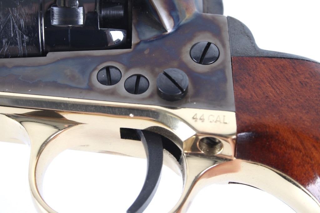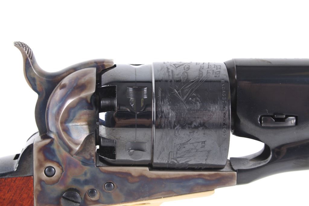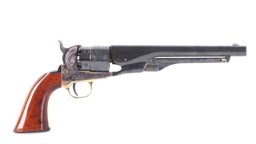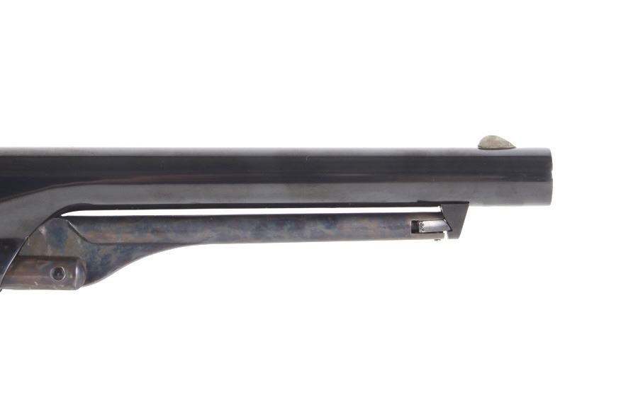 Featured in this lot is a Colt Model 1860 Army percussion cap revolver from the Colt Signature Series chambered in .44 caliber manufactured in Belgium. The revolver features an 8" barrel, etched 6 shot cylinder, walnut grips, brass trigger guard, brass blade front sight, and hammer notch rear sight. This was one of the most widely issued and popular revolvers of the Civil War, with many, if not most, going to the West after the war for Indian Wars or frontier service. This example is complete and functioning. It has matching numbers on the trigger guard, frame, and barrel. Overall, it displays an attractive deep aged patina with no evidence of having been buffed, polished, steel-wooled, or cleaned. This revolver also features the correct 8” barrel with sharp and clear Colt one line address on top, correct small front sight, attached loading lever functions correctly, one piece walnut grips fully intact. It is in excellent overall condition. The cylinder displays an engraved image of sailing ships by W.L. Ormsby and the cylinder is marked "Colt's Patent No. 786 Engraved by W.L. Ormsby New York". The top of the barrel is marked "ADDRESS COL. SAML COLT NEW-YORK U.S. AMERICA" with the side of the frame marked "Colts Patent" and ".44 CAL". The frame, trigger guard, and barrel are marked with matching serial numbers. The revolver displays wonderful condition with tight mechanics and blue'd patina. The pistol weighs 2lbs 8oz. Serial Number: 222786. This firearm qualifies as an Antique / Black Powder and does not require FFL Transfer or NICS Background Check. This is an original Colt from the factory and is from the Colt Black Powder Series.