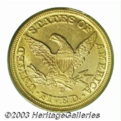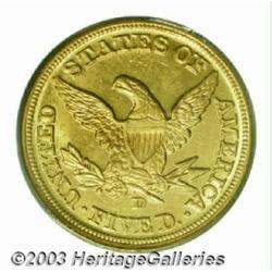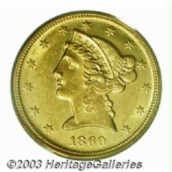 1860-D $5 MS61 PCGS. Medium mintmark. Variety 38-FF. (per Doug Winter's second edition and revised attribution system). This is the only medium mintmark variety known for this date. A large mintmark variety (38-EE) is known and it is far rarer.RARITY INFORMATION: Of the 14,635 examples originally produced, around 145 to 165 are known today. This includes 38-42 in AU grades and six or seven in Uncirculated. The finest known 1860-D half eagle is the Duke's Creek/Milas/Bareford coin that is graded MS64 and which brought $49,500 in Stack's May 1995 sale. We know of four other coins that have been graded MS62 by PCGS, an NGC MS62, and one or two PCGS MS61 coins.STRIKE: The obverse is a bit concave in appearance, as typically seen on this date. The obverse rim appears quite a bit higher than fields. Some weakness can be seen on the hair curls and on the curl below the ear. The reverse is very sharp and has less of a concave appearance.SURFACES: Most 1860-D half eagles have very heavily abraded surfaces. The Green Pond Collection coin shows some scattered marks in the fields, which are acceptable for the assigned grade. There are no mint-made grease stains as seen on many examples.LUSTER: The luster is excellent with a very frosty texture. There are some minor breaks in the obverse fields while the reverse is choice. The luster is original and has not been tampered with.COLORATION: Both sides have pleasing light to medium yellow-gold color with a slight tinge of green. This color is original. Very few 1860-D half eagles exist that show natural color and these are considered very desirable by specialists.EYE APPEAL: This is a solid, strictly Uncirculated example with full luster, good detail and pleasing coloration. Unlike many branch mint gold coins that have been graded MS61 by the major third-party services, this coin is unquestionably "new." COMPARABLES: In our January 2003 auction of the Ashland City Collection, we sold a PCGS MS62 example as lot 4808 for $21,850. In the October 1999 Bowers and Merena Bass II Auction, a PCGS MS62 example, offered as lot 1125, brought $23,000.PEDIGREE: Obtained privately from Doug Winter in September 1997. This is the plate coin in the second edition of the Winter book on Dahlonega gold. It is listed in the current Condition census as being tied with a few other coins as the fourth finest 1860-D half eagle. Important notice: Heritage usually auctions material at the rate of 200-250 lots per hour. On some occasions eBay Live bid software or the Internet may not be able to keep up with the pace of the auction. We recommend placing a realistic absentee bid now as insurance to avoid disappointment. Occasionally the auctioneer may eliminate or reject an eBay Live bid, and the auctioneer may also reopen a lot after the close of the eBay live bidding (usually because we missed an audience bid), and may reject your bid even if it shows you as the winning bidder. By bidding via eBay Live, you agree that Heritage may award the lot to another bidder at its sole discretion under the circumstances described above or any other reasonable circumstances. Also please note that all Heritage lots purchased through eBay Live carry a 20% Buyer's Premium. Please make sure you read the Terms and Conditions before you bid.
