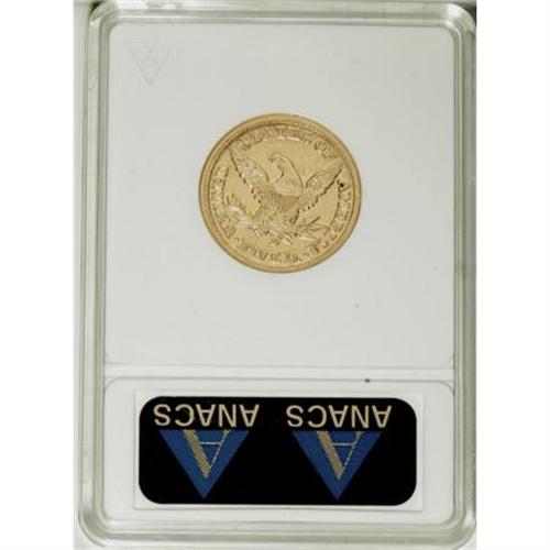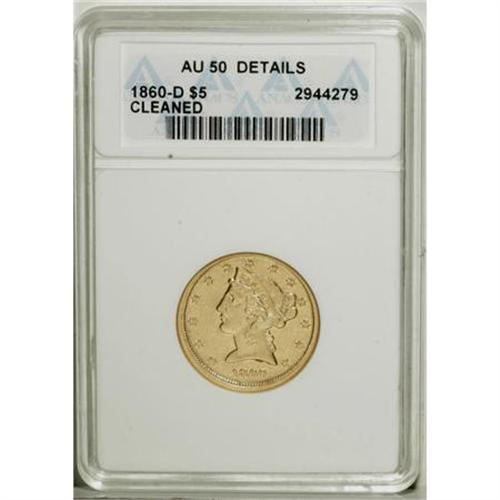 <B>1860-D $5 Medium D--Cleaned--ANACS. AU50 Details.</B></I> Variety 38-FF. Luster illuminates design recesses, and the strike is good aside from Liberty's hair. Moderately bright, and faint vertical marks are noted on the field near the profile. Fewer than 15,000 pieces were struck.<BR><BR><B>Coin Engraver:</B> Christian Gobrecht<BR><BR><b>Shipping:</b> Coins & Currency (<a target="_blank" href="http://www.heritageauctions.com/common/shipping.php">view shipping information</a>)