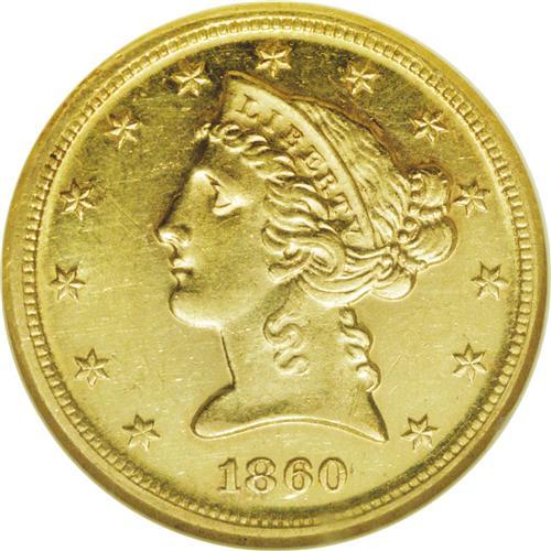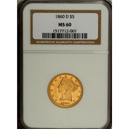 1860-D $5 Medium D MS60 NGC. Variety 38-FF, the only k