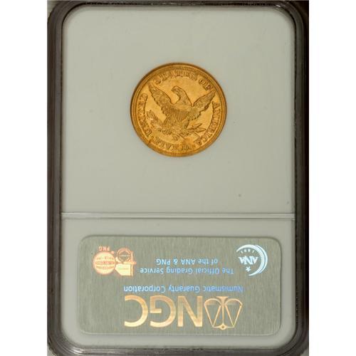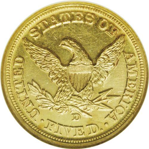 <B>1860-D $5 Medium D MS60 NGC.</B></I> Variety 38-FF, the only known Medium D variety. Two similar quality MS60 grade pieces in the present sale provide the collector with an excellent bidding opportunity and a choice of pieces, an unusual circumstance. This satiny Mint State piece has brilliant light gold color with a few faint traces of iridescent toning. Faint hairlines on each side are typical, and clearly the grade limiting factor for this coin. Like most examples, this piece is mostly sharp with fine detail on both sides, with only slight weakness on the eagle's neck. Census: 3 in 60, 10 finer (11/06).<BR><BR><b>Shipping:</b> Coin/Currency (<a target="_blank" href="http://www.heritageauctions.com/common/shipping.php">view shipping information</a>)