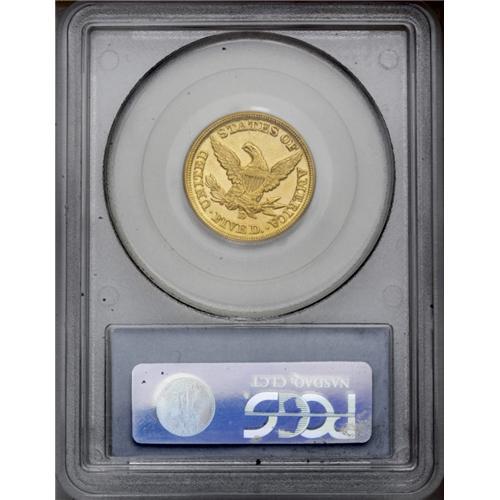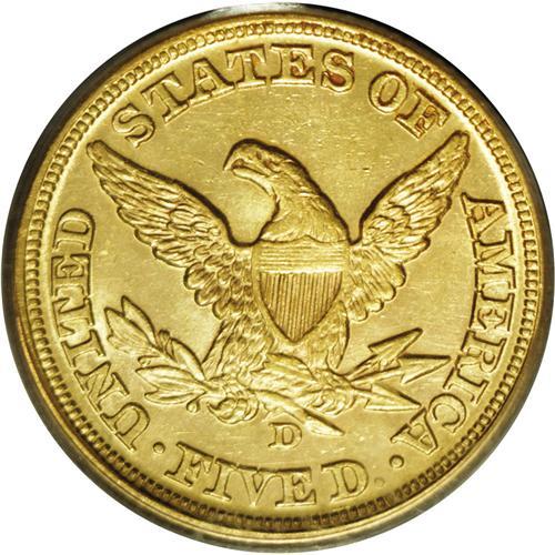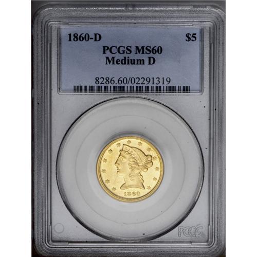 <B>1860-D<$5> Medium D MS60 PCGS.</B></I> Variety 38-FF. Mintages of half eagles at Dahlonega fell substantially after 1854, when the San Francisco Mint began to coin California-mined gold. Prior to this time, bullion was often shipped to the Eastern seaboard in non-coin form, and a portion of this dramatic inflow of gold ended up at Dahlonega. By 1860, however, production of the flagship denomination, the half eagle, amounted to only 14,635 pieces. Among half eagles from the Georgian facility, only the 1859-D and the 1861-D have smaller mintages. This impressive, shimmering example is well struck aside from minor softness on the eagle's neck, and the surfaces are smooth except for a pair of faint pinscratches from the bust truncation.