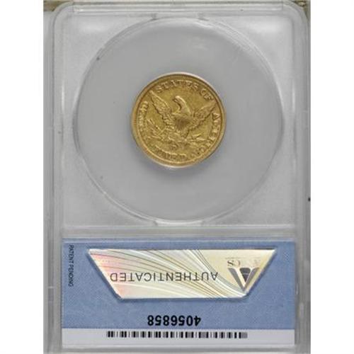 <B>1860-D $5 Medium D--Scratched--ANACS. XF40 Details.</B></I> Variety 38-FF. Some shallow, horizontal scratches on Liberty's cheek account for the ANACS designation. Fairly well defined, with bright yellow-gold surfaces that reveal a few minute contacts.<BR><BR><B>Coin Engraver:</B> Christian Gobrecht<BR><BR><b>Shipping:</b> Coins & Currency (<a target="_blank" href="http://www.heritageauctions.com/common/shipping.php">view shipping information</a>)