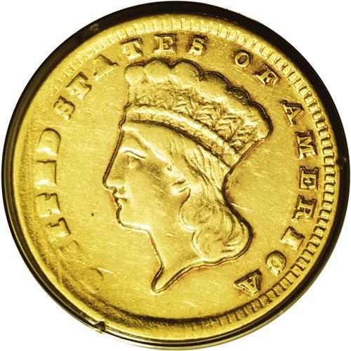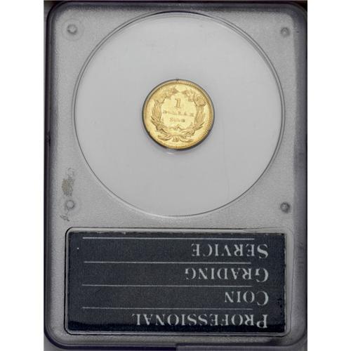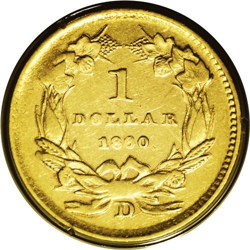 <B>1860-D<G$1> XF45 PCGS.</B></I> Variety 12-P. A mere 1,566 pieces were struck for this late Dahlonega issue. A bright straw-gold example, sharply defined for the XF45 grade despite striking softness at the left borders. The right obverse has a couple of wispy pinscratches that can only be observed under a glass. Encapsulated in a first generation holder.