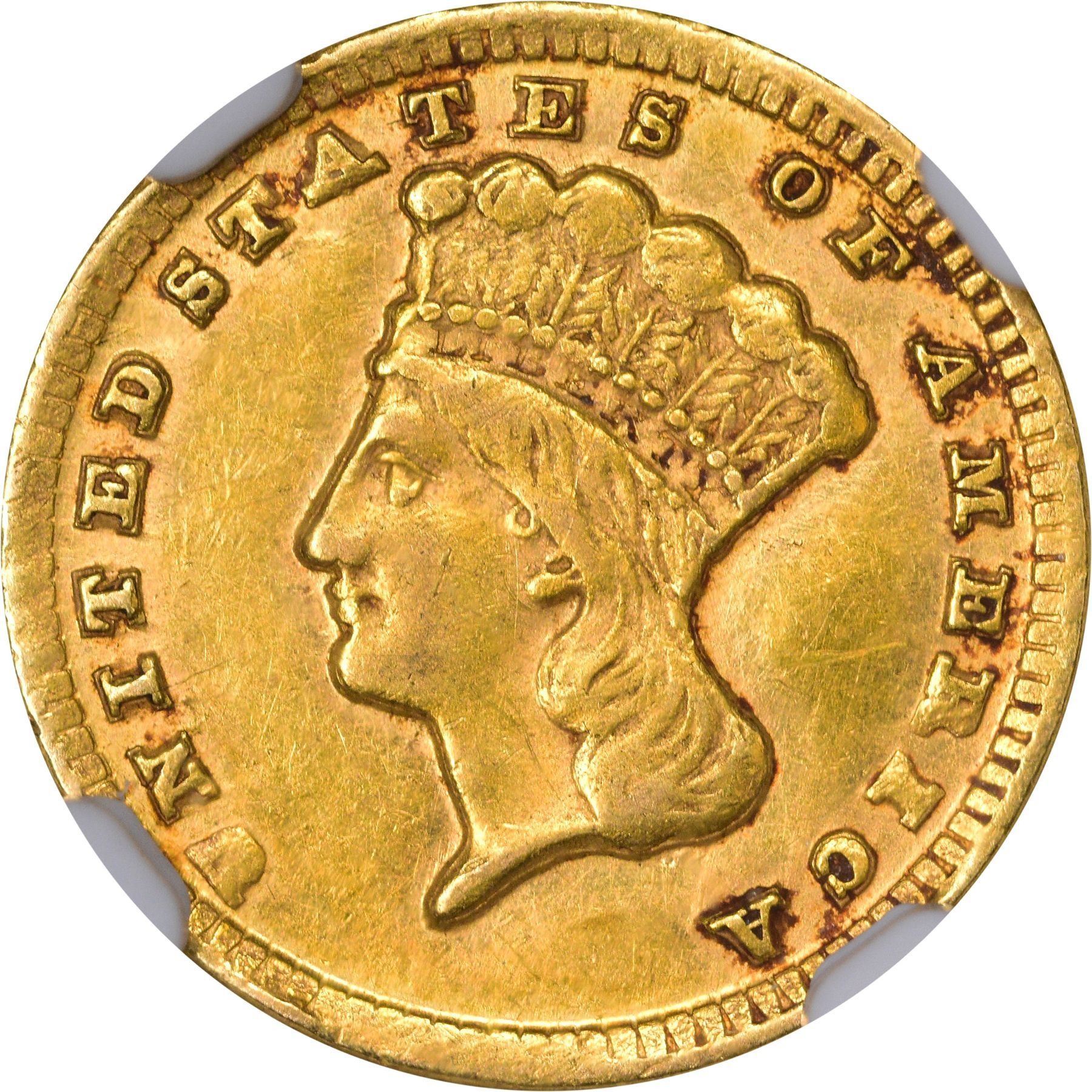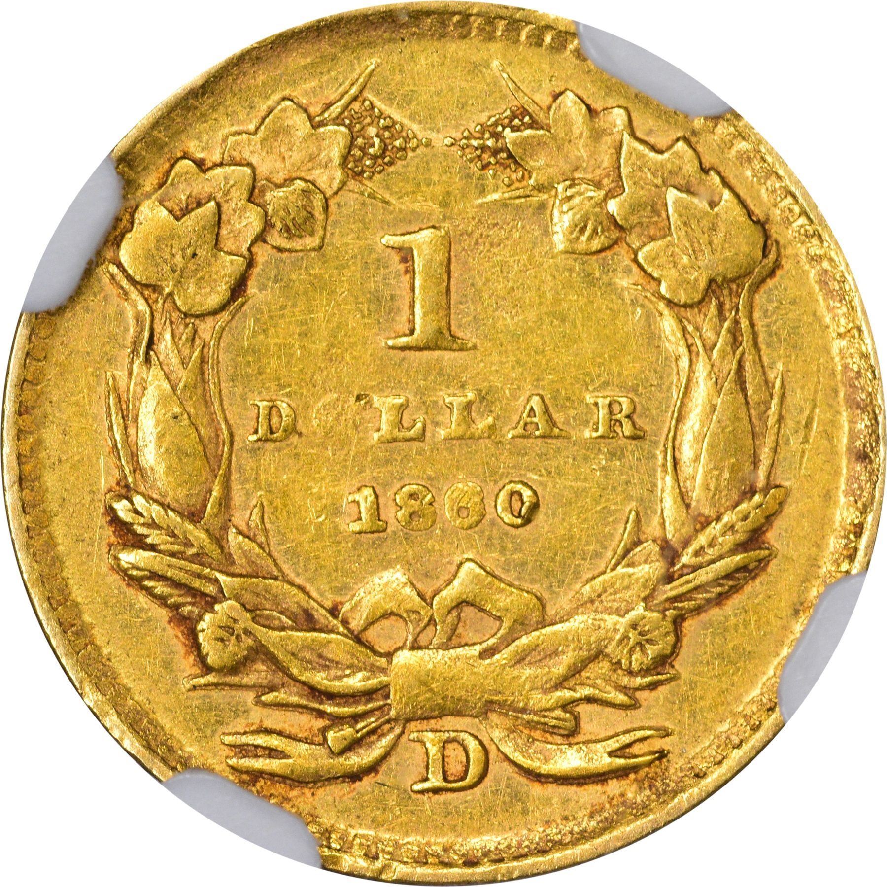 Description: A warm honey-gold glow and an abundance of soft underlying luster greet the viewer’s eye. This important low-mintage Dahlonega date saw a production run of just 1,566 pieces, and probably only 100 to 150 pieces could be accounted for today in all grades. The majority of 1860-D gold dollars known to current collectors are EF to AU; many EF-AU gold coins owe their existence to the withdrawal of coins from circulation by the general public for hoarding during the Civil War – gold coins first, followed by silver and eventually even the lowly coppers – thus preventing extensive circulation. The present coin is placed in the NGC holder horizontally so that the top of Liberty’s portrait faces 9 o’clock; it’s simply a packaging mistake that NGC would no doubt correct. Typical striking weakness for the date on the design high points; the O in DOLLAR is weak and nearly invisible to the unaided eye. Winter’s reference on the Dahlonega Mint issues notes: “The 1860-D is the worst-struck Dahlonega gold dollar.” A bulge is seen in the obverse field at 3 o’clock, and not related to damage of any sort other than a collapsing obverse die. Probably fewer than 10 truly Mint State pieces can be accounted for today. Worth more than a casual glance.            NGC Census: 5; 4 finer (MS-64 finest).