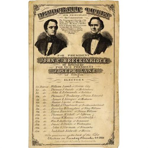 <B>DEMOCRATIC TICKET FOR JOHN C. BRECKINRIDGE & JOSEPH LANE, 1860.</B></I> When the reconvened Democratic National Convention nominated Stephen A. Douglas of Illinois for the presidency in June of 1860, outraged delegates from the Deep South walked out. The Little Giant refused to support these delegates' insistence upon a federal Slave Code protecting human bondage in the western territories, preferring a policy of popular sovereignty. They reconvened at another hall in the convention city of Baltimore and put forward their own ticket featuring John C. Breckinridge of Kentucky and Senator Joseph Lane of Oregon. This is one of the original tickets. 4 7/8” x 7 7/8”. <BR><BR><B>Provenance: </B></I>Al. Emmett Fostell Collection<B> </B></I><BR><BR><B>Condition:</B></I> Very good, has light foxing, small tears.<BR><BR><b>Shipping:</b> Miscellaneous Collectibles, Smal (<a target="_blank" href="http://www.heritageauctions.com/common/shipping.php">view shipping information</a>)
