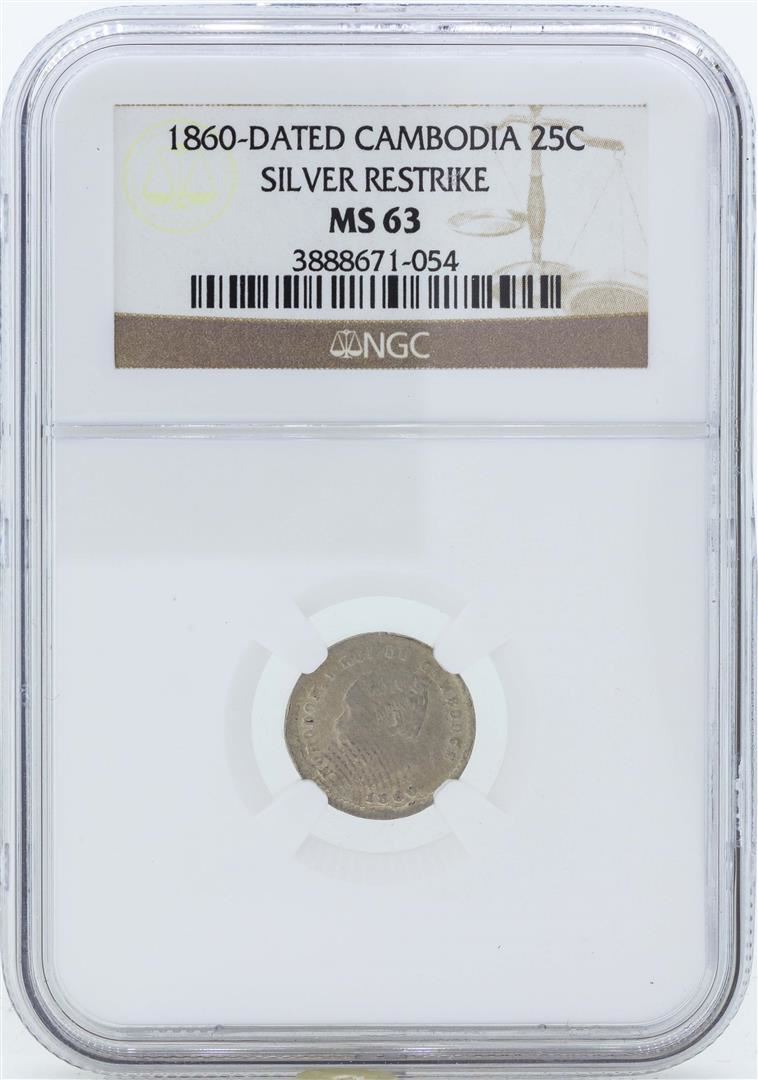 One 1860 Dated Cambodia 25 Centimes Silver Restrike Coin NGC MS63. NGC Certified.