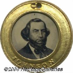 <B>Unusual 1860 Douglas/Johnson Ferrotype</B></I> <BR>Plain brass border has a textured surface, similar to Sullivan's SD 1860-47, but is smaller and has names below portraits. Unlisted in Hake. We cannot recall seeing this handsome variety before. Choice condition. 21 mm. <I>From the Joe Brown Collection.</B></I> <BR><BR><B>Important notice:</B> Heritage usually auctions material at the rate of 200-250 lots per hour. On some occasions eBay Live bid software or the Internet may not be able to keep up with the pace of the auction. We recommend placing a realistic absentee bid now as insurance to avoid disappointment. Occasionally the auctioneer may eliminate or reject an eBay Live bid, and the auctioneer may also reopen a lot after the close of the eBay live bidding (usually because we missed an audience bid), and may reject your bid even if it shows you as the winning bidder. By bidding via eBay Live, you agree that Heritage may award the lot to another bidder at its sole discretion under the circumstances described above or any other reasonable circumstances. Since eBay bids are not shown to us until we open the lot on the floor, we treat those bids just like floor bids. In most cases the floor responds before the eBay bid is presented to us, due to Internet lag time, so for consistency we have made it a policy that floor bids are always considered first over tie eBay live bids. Also please note that all Heritage lots purchased through eBay Live carry a 20% Buyer's Premium. Please make sure you read the Terms and Conditions before you bid. Lot:27243