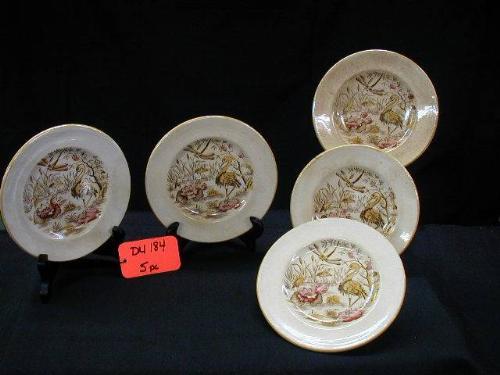 1860 ENGLISH IRONSTONE (5) 6in PLATE, TRANSFERWARE LUSTER GLAZE FLORAL & FAUNA DESIGN EXCELLENT (1 W/BROWNING)
