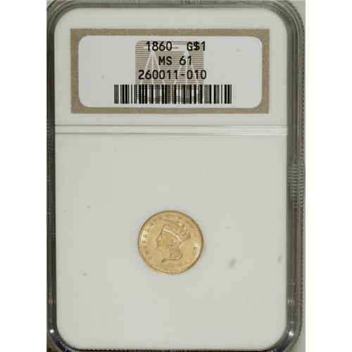 1860 G$1 MS61 NGC. NGC Census: (26/77). PCGS Popul