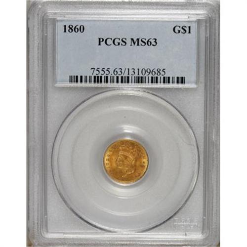 <B>1860 G$1 MS63 PCGS.</B></I> A lovely and original green-gold representative of this better date gold dollar. Much scarcer than the 1855, which trades for 10 times as much. Population: 14 in 63, 21 finer (4/07).<BR><BR><b>Shipping:</b> Coins & Currency (<a target="_blank" href="http://www.heritageauctions.com/common/shipping.php">view shipping information</a>)