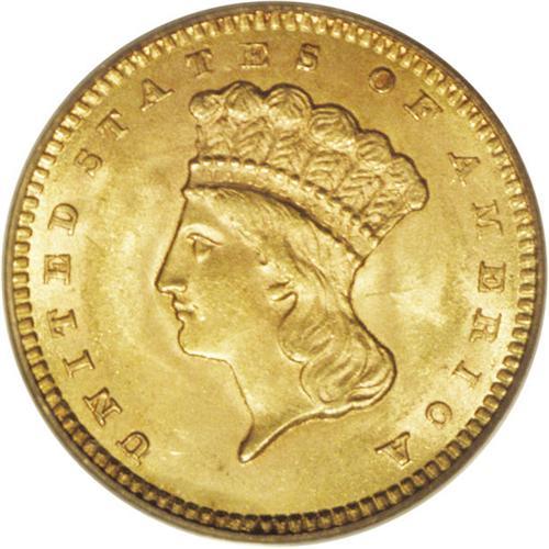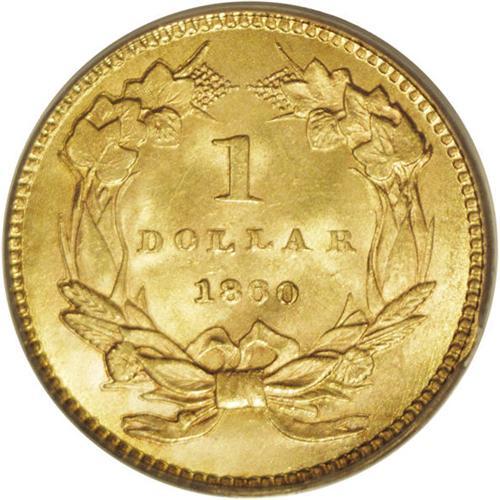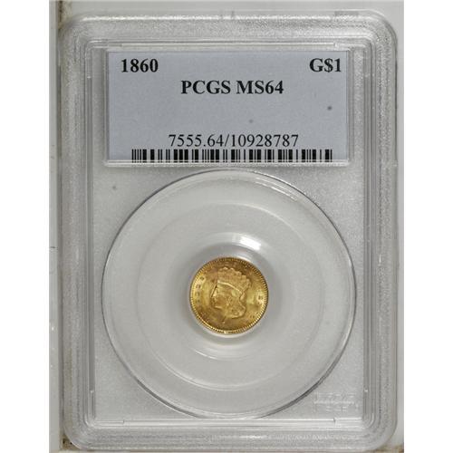 <B>1860 G$1 MS64 PCGS.</B></I> A low mintage gold dollar with only 36,668 pieces produced. In this case, the lower mintage does equate to a lower availability, especially in mint condition. This piece is remarkably well struck with rich orange-gold mint luster. A high-end example of this scarcer Type Three issue. Population: 13 in 64, 8 finer (12/06).<BR><BR><b>Shipping:</b> Coin/Currency (<a target="_blank" href="http://www.heritageauctions.com/common/shipping.php">view shipping information</a>)