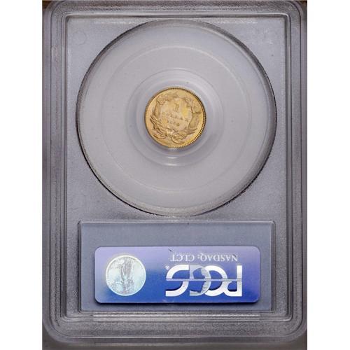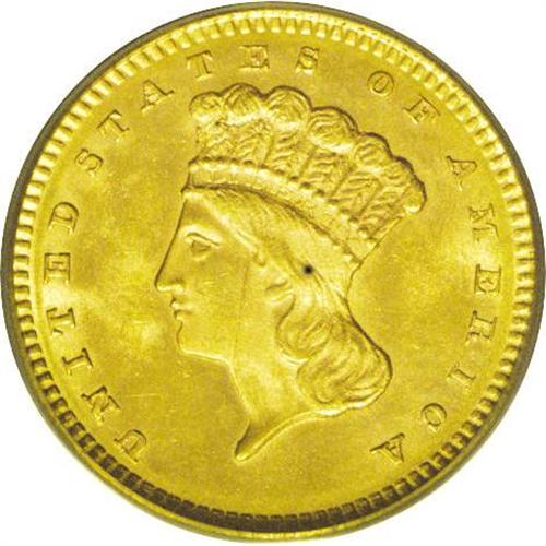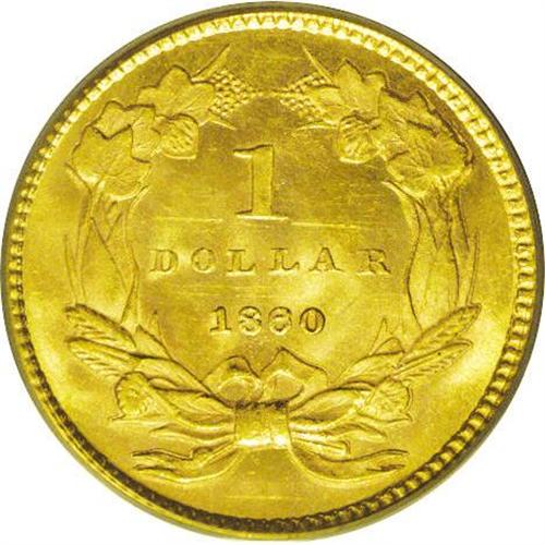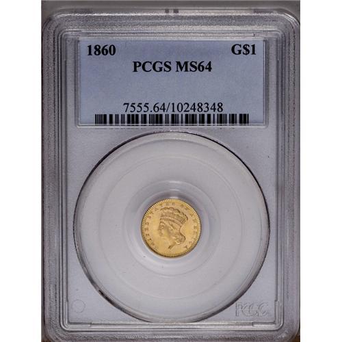 <B>1860<G$1> MS64 PCGS.</B></I> The 1860 has a relatively low mintage with only 36,668 pieces produced. High grade examples are especially elusive with only 14 coins so graded by PCGS and eight finer (4/06). This is a visually interesting coin that has uncommonly pronounced mint luster. The light orange-gold coloration seen over each side shows a wide, diagonal streak of lilac across the reverse. Minimally abraded.