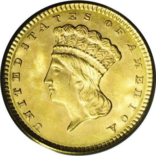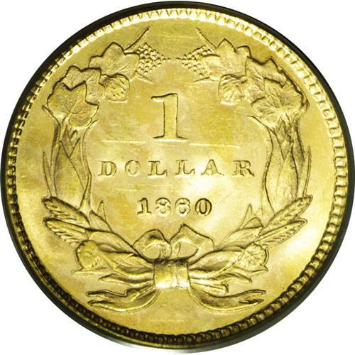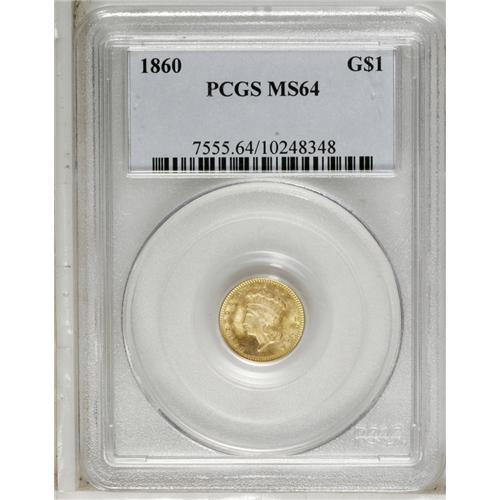 <B>1860<G$1> MS64 PCGS.</B></I> The 1860 has a relatively low mintage with only 36,668 pieces produced. High grade examples are especially elusive with only 12 coins so graded by PCGS and eight finer (8/06). This is a visually interesting coin that has uncommonly pronounced mint luster. The light orange-gold coloration seen over each side shows a wide, diagonal streak of lilac across the reverse. Minimally abraded.