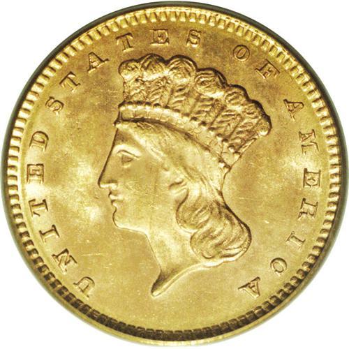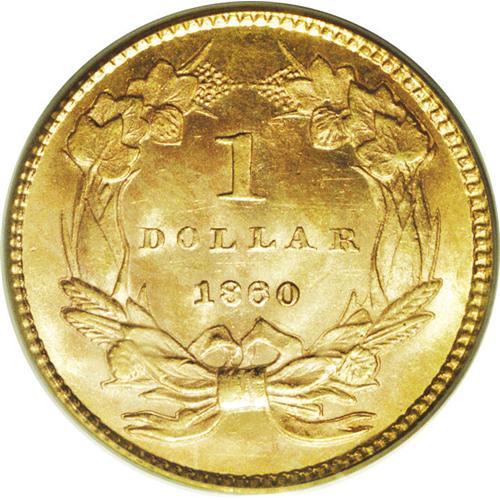 <B>1860 G$1 MS64 PCGS.</B></I> The 1860 has a relatively low mintage with only 36,668 pieces produced. High grade examples are especially elusive with only 13 coins so graded by PCGS and eight finer (12/06). This is a visually interesting coin that has uncommonly pronounced mint luster. The light orange-gold coloration seen over each side shows a wide, diagonal streak of lilac across the reverse. Minimally abraded.<BR><BR><b>Shipping:</b> Coins & Currency (<a target="_blank" href="http://www.heritageauctions.com/common/shipping.php">view shipping information</a>)