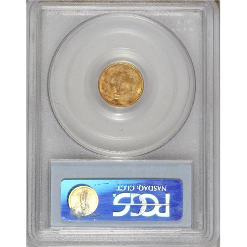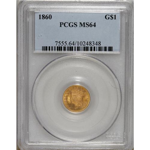 <B>1860 G$1 MS64 PCGS.</B></I> The 1860 has a relatively low mintage with only 36,514 circulation strikes produced. High grade examples are especially elusive with only 12 coins so graded by PCGS and nine finer (4/07). This is a visually interesting coin that has uncommonly pronounced mint luster. The light orange-gold and mint-green coloration is seen over each side. Sharply struck and minimally abraded.<BR><BR><b>Shipping:</b> Coins & Currency (<a target="_blank" href="http://www.heritageauctions.com/common/shipping.php">view shipping information</a>)