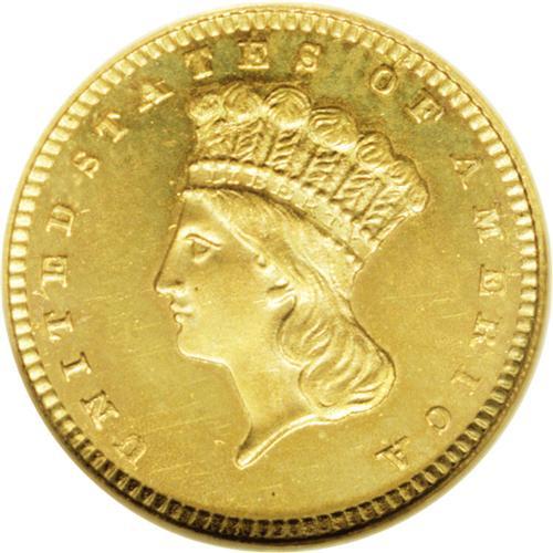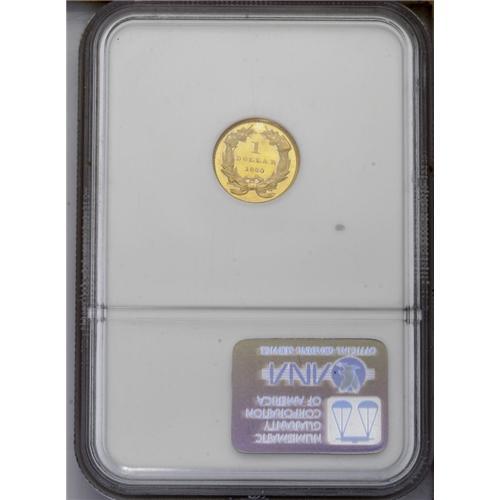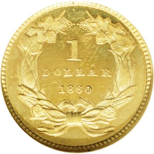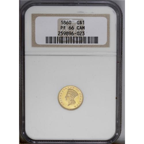 <B>1860<G$1> PR66 Cameo NGC.</B></I> According to Mint records, 154 proof gold dollars were produced at Philadelphia in 1860, although it is believed that fewer than four dozen are extant today. That rarity is confirmed by the current population statistics, which show a total of 33 pieces graded as both Cameo and non-Cameo specimens by both services (1/06). Undoubtedly, a number of these are likely resubmissions.<BR> The mirrored fields are colored an even orange-gold, but surrounding the frosted head of Liberty is a thin line of light yellow-gold, highlighting the cameo effect. There is one small area of brilliance just below the ear of the frosted head, giving the appearance of a sparkling gem earring. The reverse is equally attractive from the standpoint of color, but there is some light porosity at the O in DOLLAR, and a minute lintmark above the A. These minor imperfections are only mentioned for future identification purposes. Rest assured that this will be a very popular item in the sale.<BR><I>From The Larj Collection.</B></I>