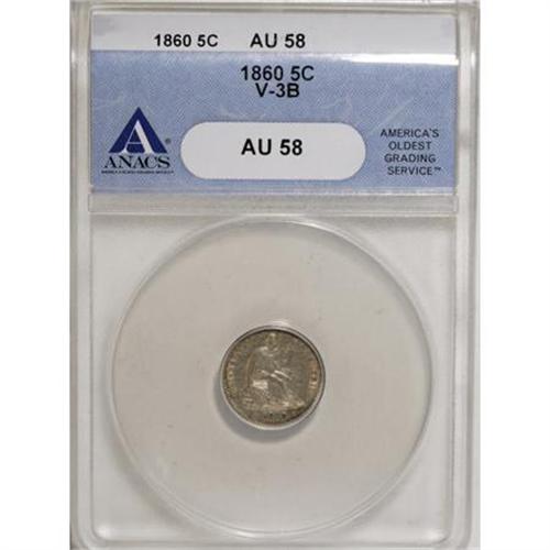<B>1860 H10C AU58 ANACS.</B></I> V-3B. NGC Census: (16/404). PCGS Population (18/370). Mintage: 799,000. Numismedia Wsl. Price for NGC/PCGS coin in AU58: $110. (#4377)<BR><I>From The Al Blythe Collection of Half Dimes.</B></I><BR><BR><B>Coin Engraver:</B> Christian Gobrecht<BR><BR><b>Shipping:</b> Coins & Currency (<a target="_blank" href="http://www.heritageauctions.com/common/shipping.php">view shipping information</a>)