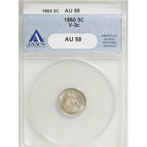 <B>1860 H10C AU58 ANACS.</B></I> V-3c. NGC Census: (16/404). PCGS Population (18/370). Mintage: 799,000. Numismedia Wsl. Price for NGC/PCGS coin in AU58: $110. (#4377)<BR><I>From The Al Blythe Collection of Half Dimes.</B></I><BR><BR><B>Coin Engraver:</B> Christian Gobrecht<BR><BR><b>Shipping:</b> Coins & Currency (<a target="_blank" href="http://www.heritageauctions.com/common/shipping.php">view shipping information</a>)